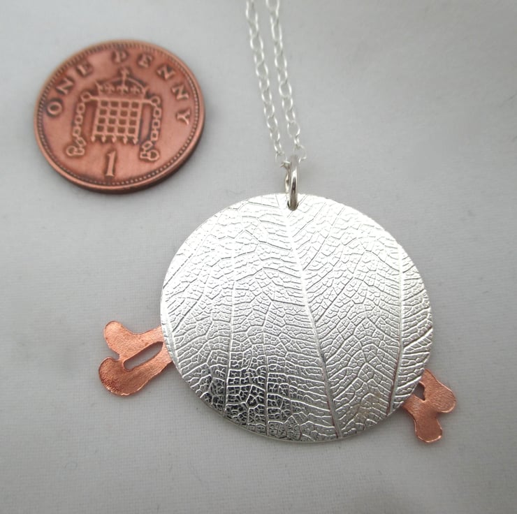 This is a substantial piece of jewellery, weighing 7.5g without the chain, its is hand cut from copper and silver sheet metal using an old fashioned piercing saw, and traditional metalsmithing techniques. It is totally hand made, cut and soldered by me in my studio in an afternoon when the light is at it's best.