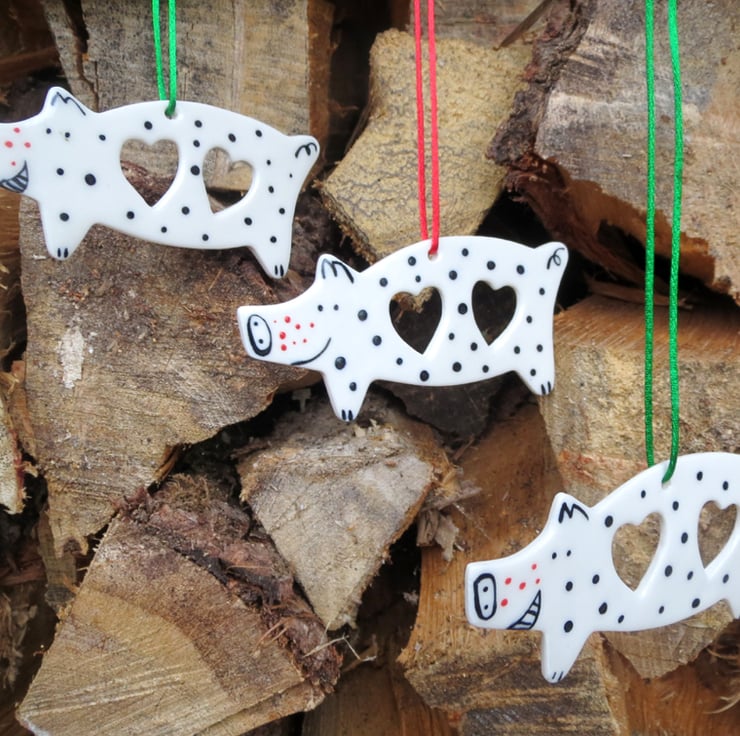 Handmade porcelain pig tree decoration with small heart windows.It measures 10 x 5 cm .It is biscuit fired and then painted with underglaze colour and glaze fired.You can choose between a red or a green 2 mm ribbon .This one has a cheesy grin.