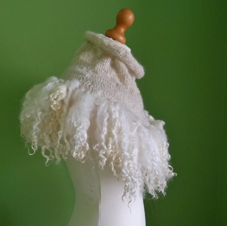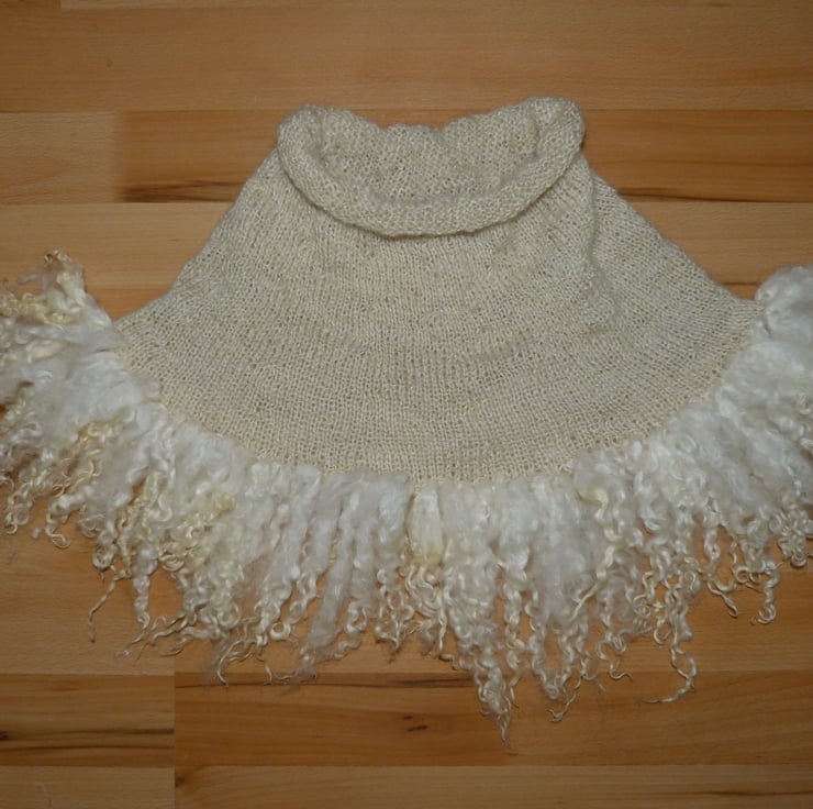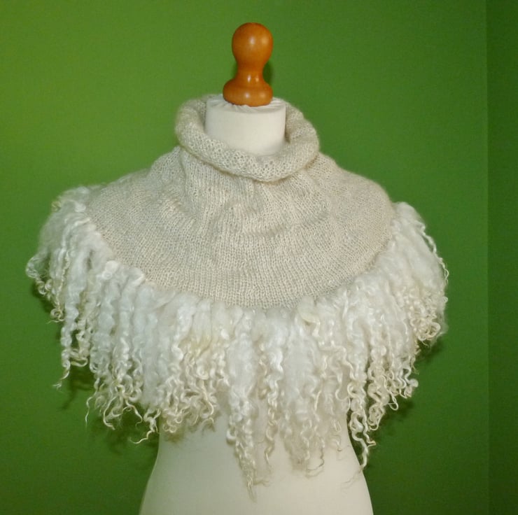I have designed and created this cowl using my hand-spun Wensleydale yarn.This cowl is hand knitted in the round, from the top down, with Wensleydale locks being incorporated in the cast off hem.