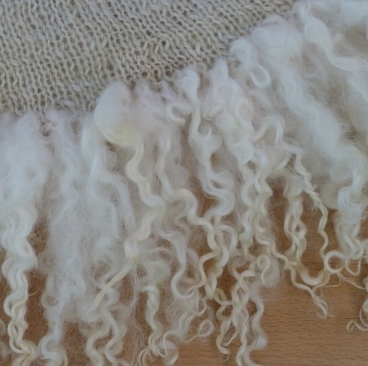 I love working with Wensleydale fleece and after spinning some as yarn, I was inspired to create this pattern to use the un-spun locks to make a fringe for this superb cowl.