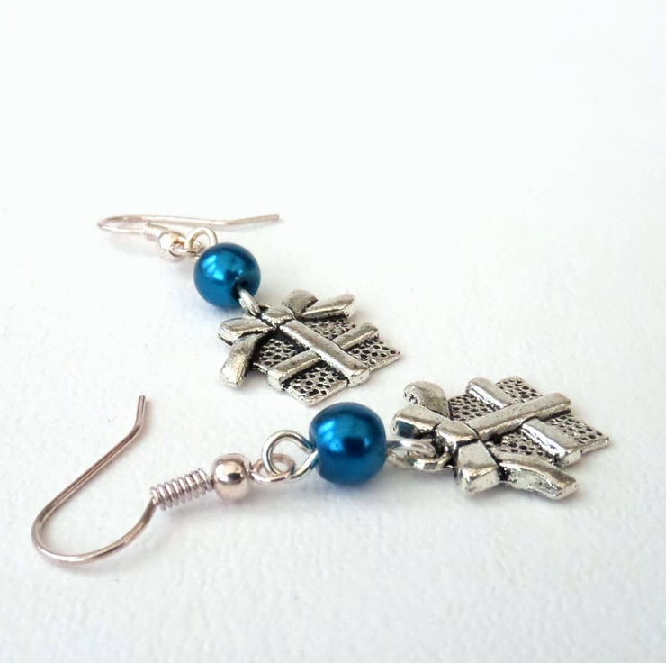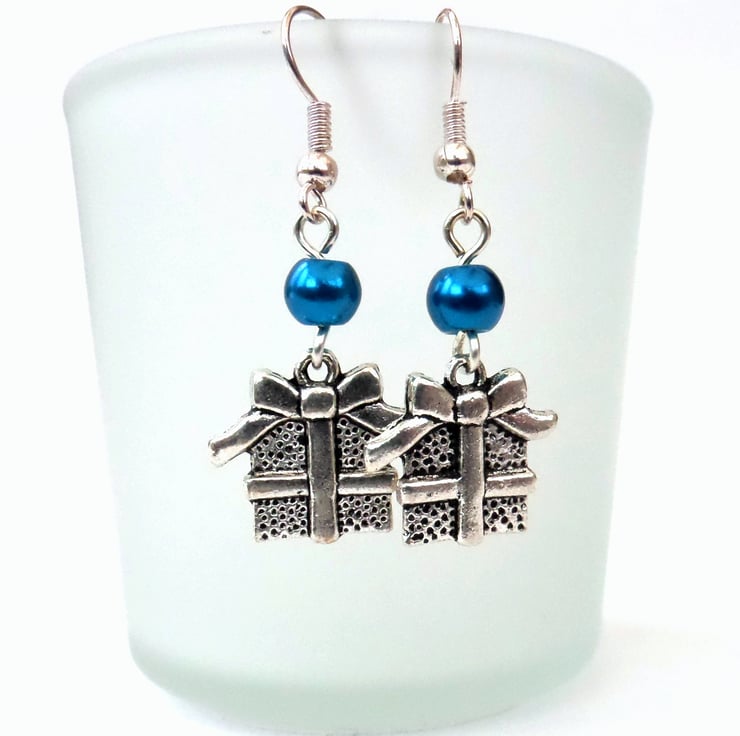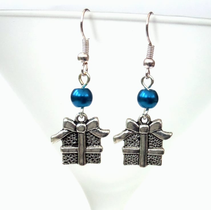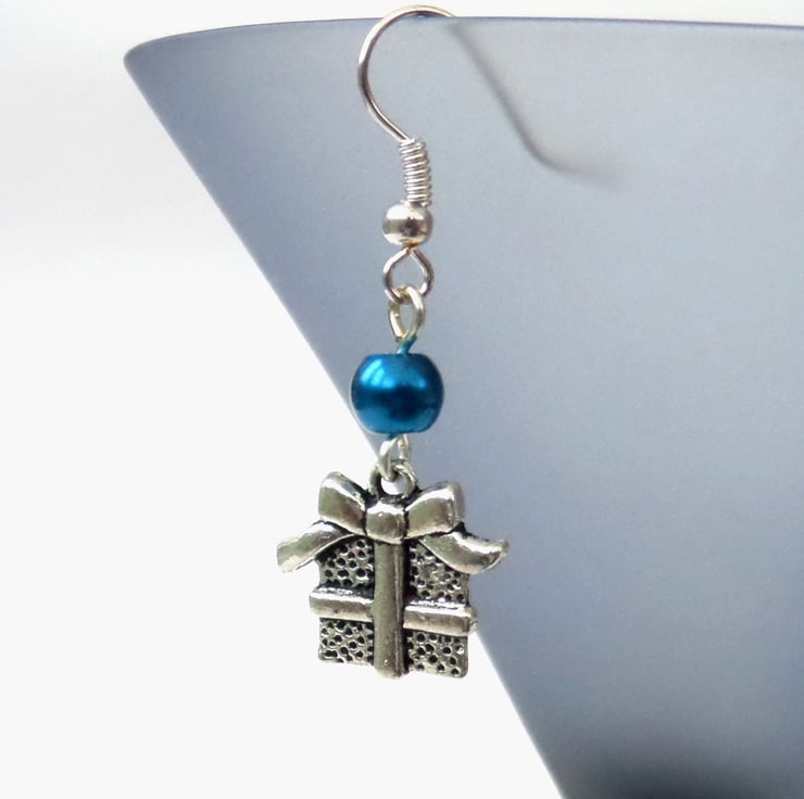I have used a lovely shade of blue glass pearl, hung with a parcel charm in tibetan silver and hung from silver plated earwires.