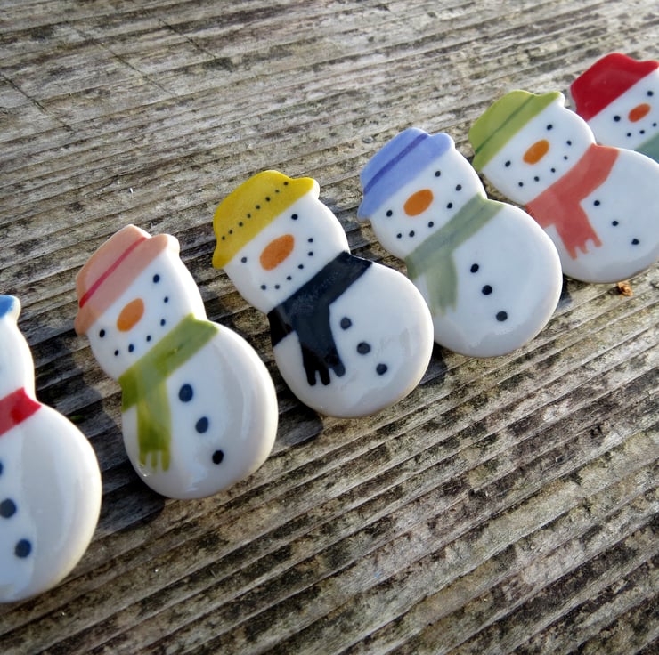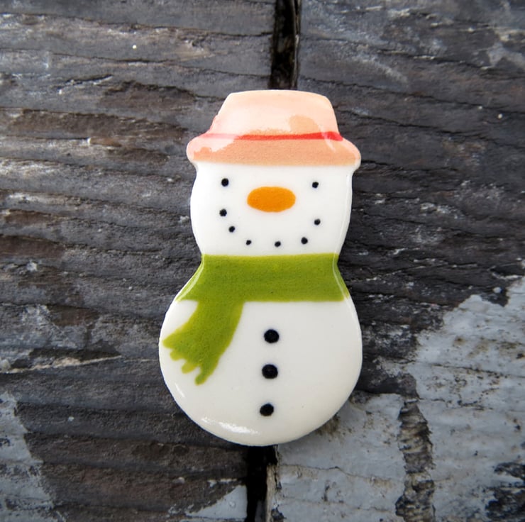 Little Snowman Brooch (measures 4 x 2 cm) handmade by me in porcelain.After biscuit firing the snowman is handpainted and glaze fired.This little chap has a pink hat and green scarf.The perfect Chistmas brooch to put you in the mood.great size for a stocking filler for all ages and gender.