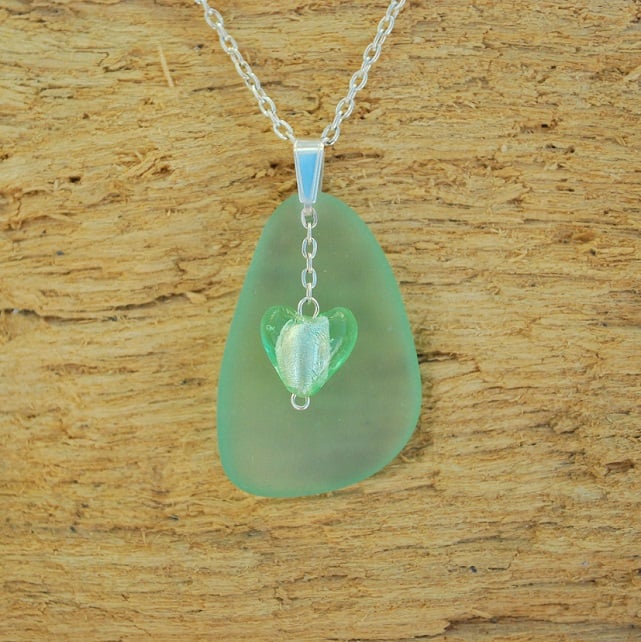 We have made this delightful pendant from a carefully selected piece of beach glass and a matching silvered glass heart. The glass is quite thick and curves behind the heart. The colours are very soft and the glass has a wonderful way of catching the light. We have tumbled the glass so it is perfectly rounded and silky smooth.