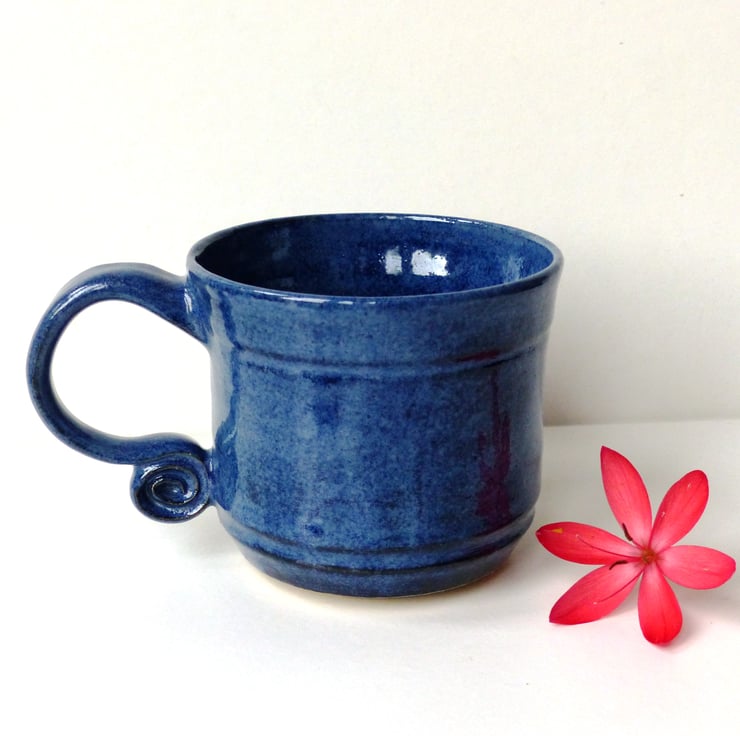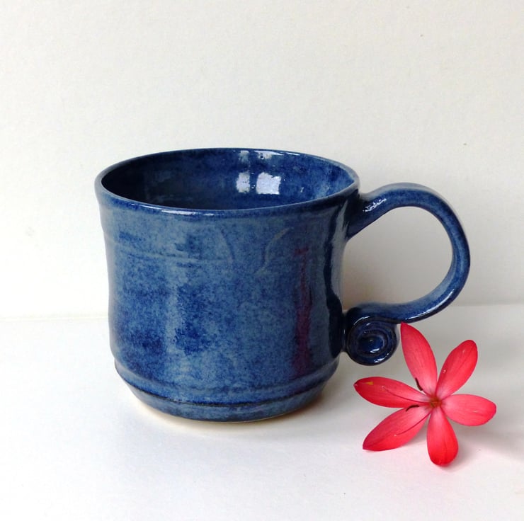 This one I threw on the potter's wheel using a buff stoneware clay. I then turned the base and added the handle before bisque firing the mug. I glazed it using a deep blue that has wonderful light blue flexes.
