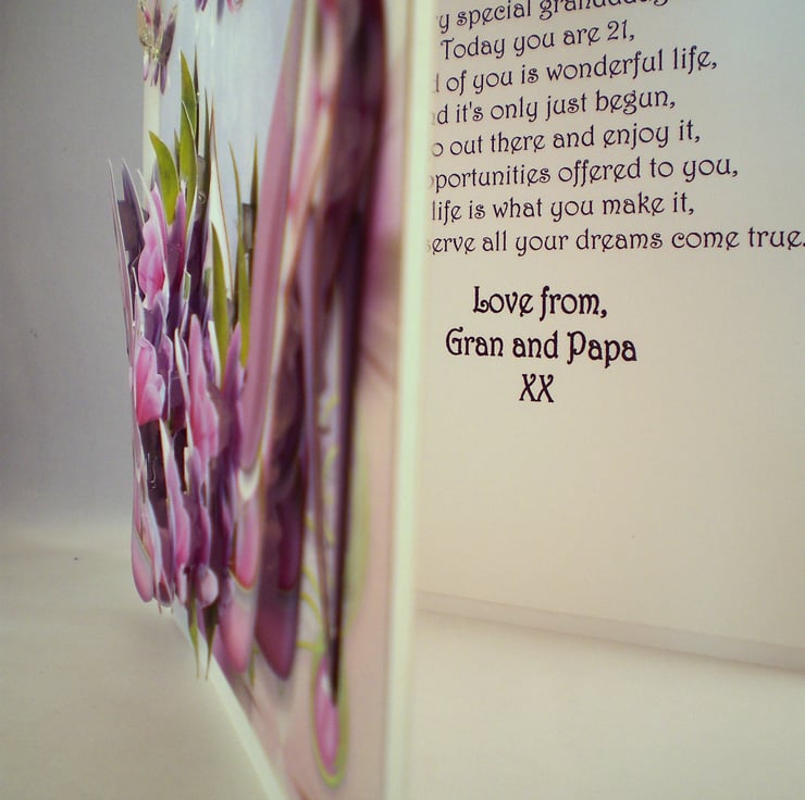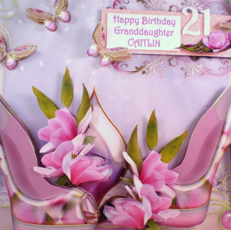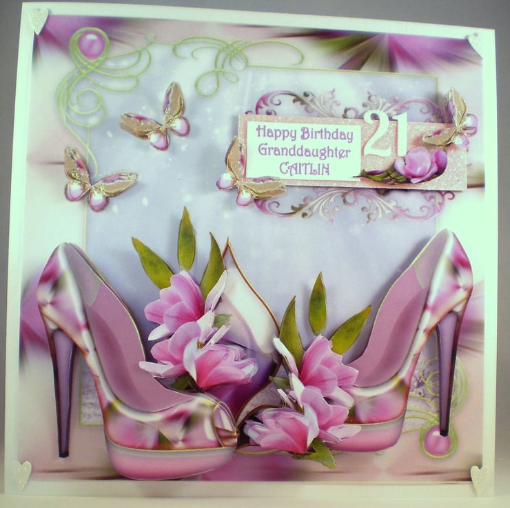 A large square white card measuring approximately195x 195mm (7.7vx7.5in) features beautiful decoupage/3D pink shoes and flowers .
