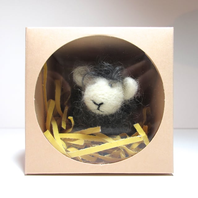 This rather special little sheep comes complete with a box to live in and bedding to make a cosy bed. The box measures 70mm x 70mm x 70mm with a separate lift-off lid, and a clear window.