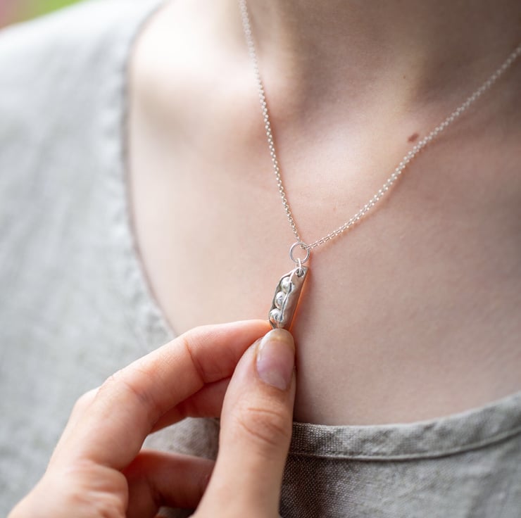 A beautiful sterling silver necklace in the shape of a pea pod.