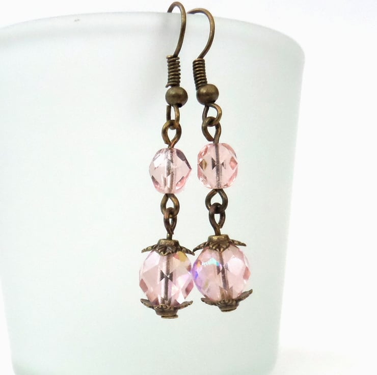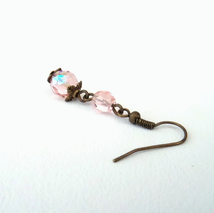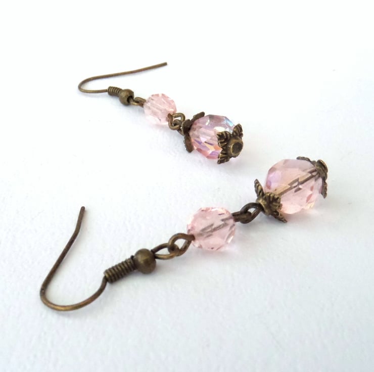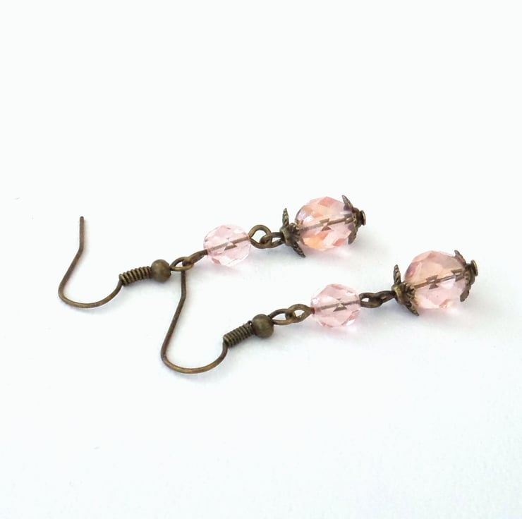 A lovely pair of unique earrings, made with pretty peachy pink crystals and hung on bronze wires.