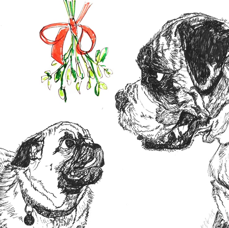 Love dogs? Love christmas? Share the love by giving friends and family this unique card this festive season. Printed from an original Ink Pen drawing by Kelly Stanley, this card features Bilbo the Pug and Tilly the Boxer sharing an intimate and adorable moment by the mistletoe!