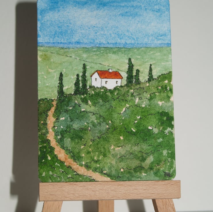 This ACEO is an original, hand painted watercolour of a little farmhouse looking out over the Algarve in Southern Portugal. It measures 2.5 x 3.5 inches (63 x 89mm).