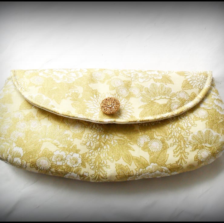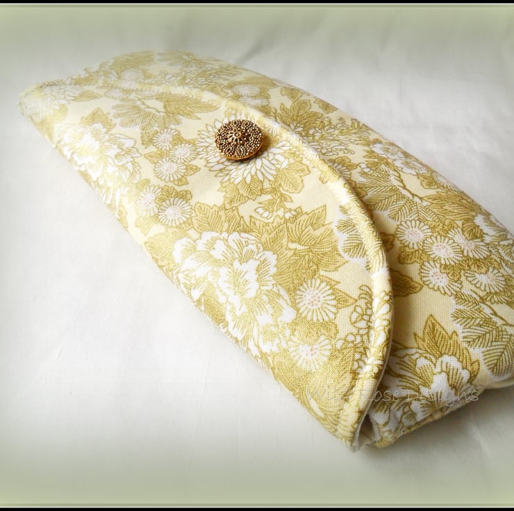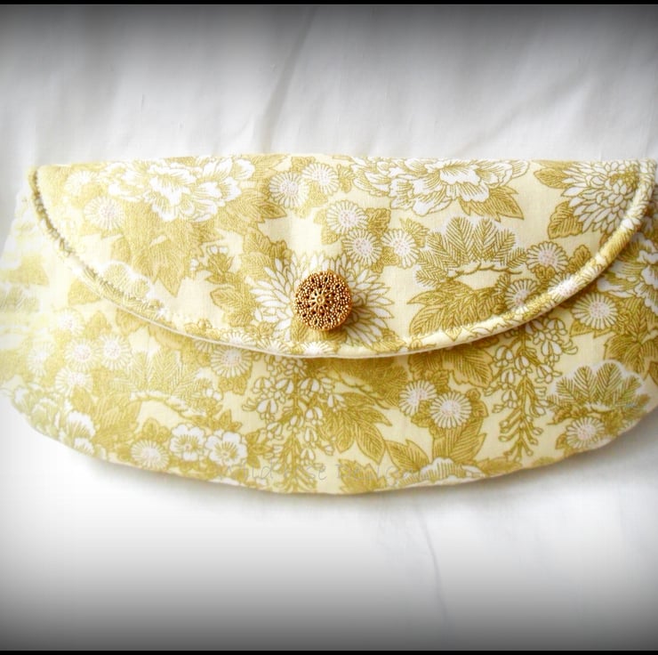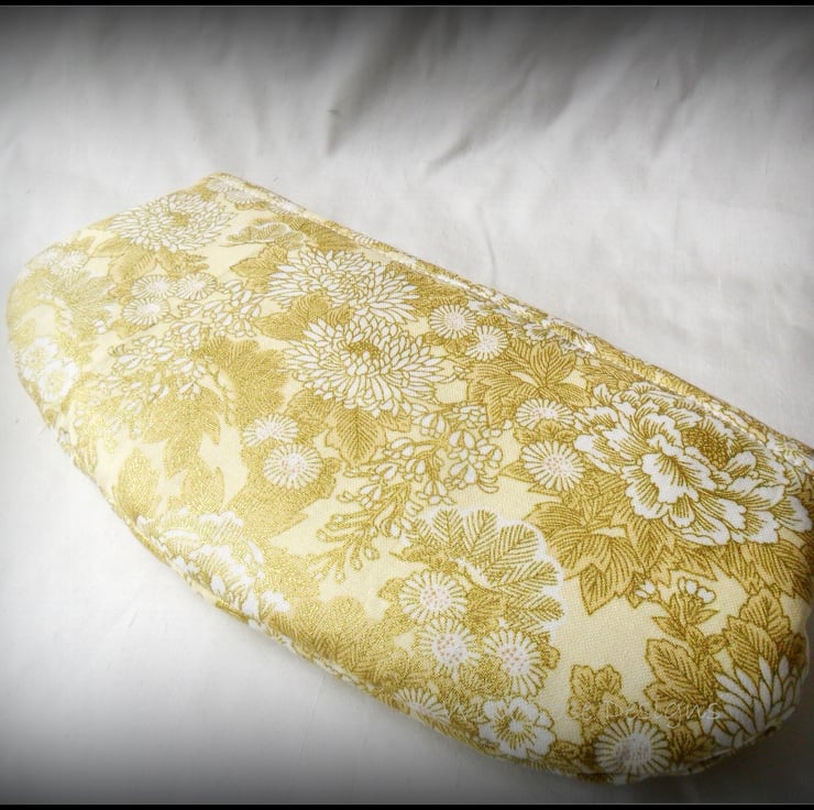 Lovely clutch style make-up bag, handmade in a gold floral print cotton and lined in cream cotton sateen. Trimmed with a gold tone filigree button, the flap fastens with a small magnetic snap. The make-up bag measures approximately 9 1/4" x 4 1/2" (23.5 x 11 cm ) and comes with a set of mini make-up brushes.