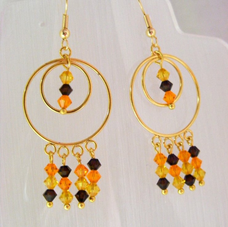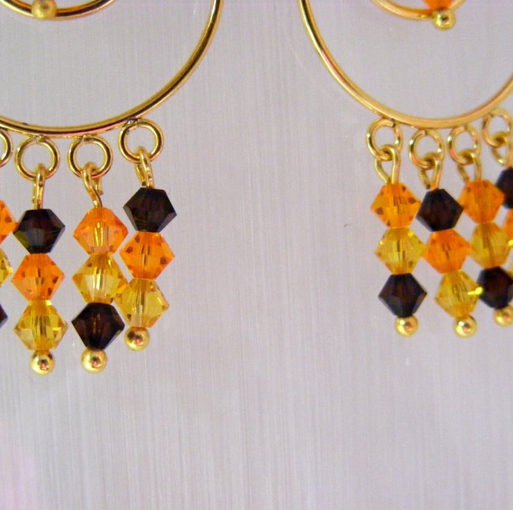 I have made this pair of hoop dangling earrings by threading 4 mm swarovski crystal bicones in mocca, sun and sunflower colours onto gold plated ball headpins. After turning a loop I attached the crystals to the gold plated hoop findings. Ear wires are also gold plated. Earrings are reduced to clear.
