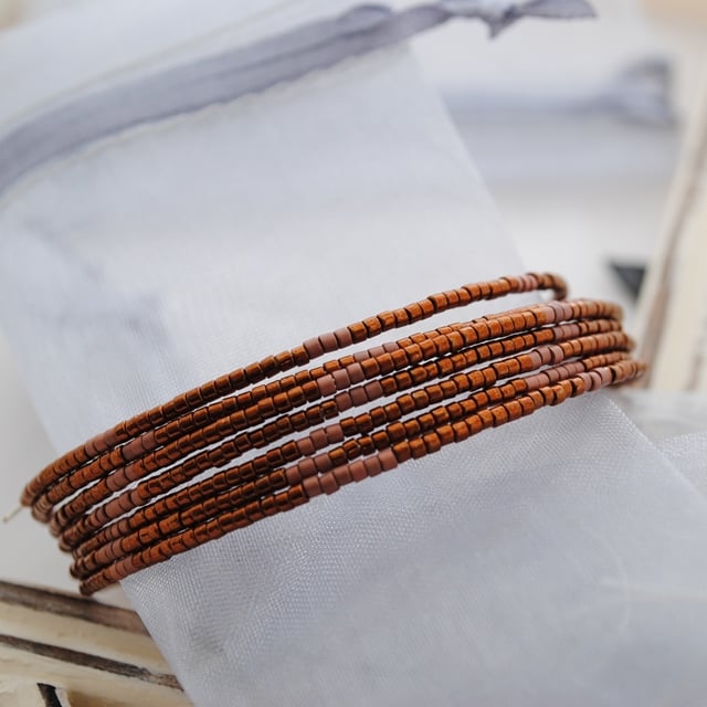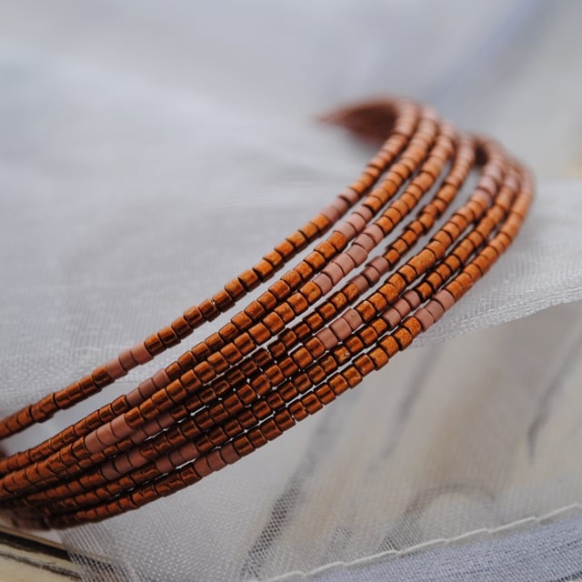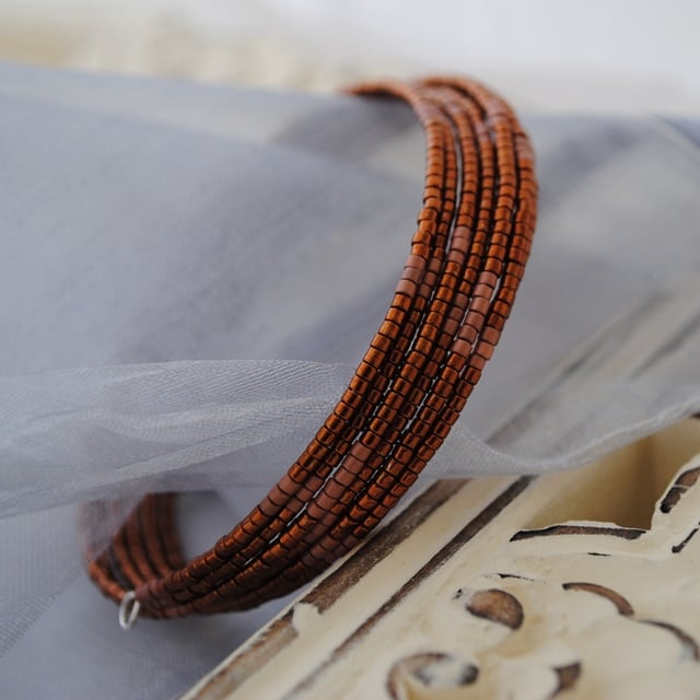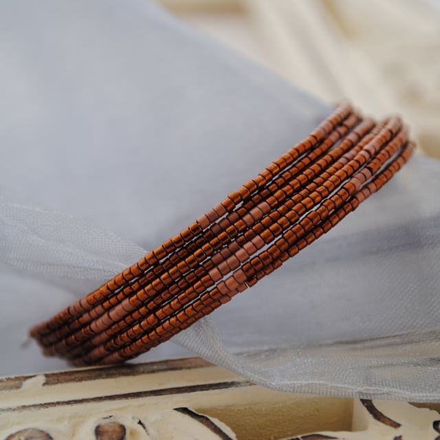 Wrap bracelet with a mix of quality miyuki delica quality seed beads in matt and glossy lustre copper. The bracelet is made using 7 loops of silver plated memory wire and will fit any size wrist.