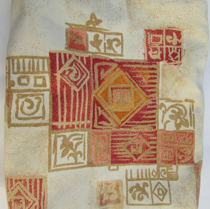 Cream tote bag with a lovely abstract print pattern in red, terracotta and gold. The bag is fully lined with a rich gold fabric with a satin sheen.