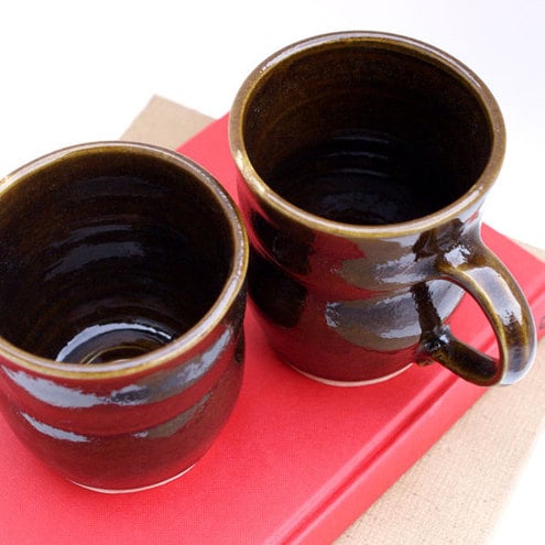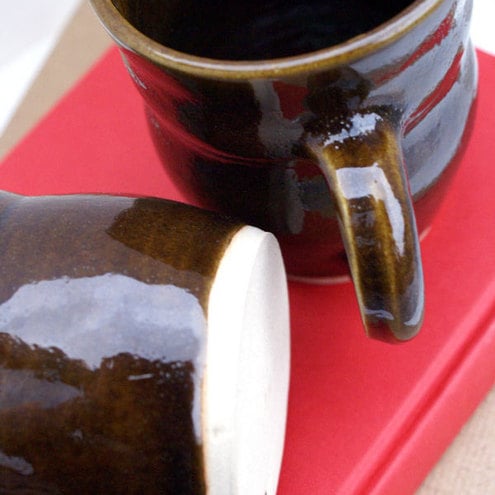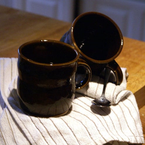 These mugs have been glazed in tenmoku which has given a slick black finish. The mugs have a bulbous shape which helps to keep tea hot as the hot water swirls around inside.