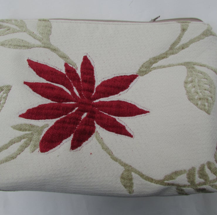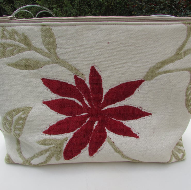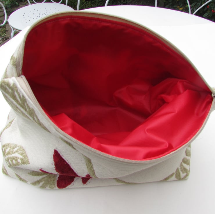 Toiletry bag in a cream fabric with a beige leaf pattern and a large red flower. Flower and leaves have a plush texture. Zipped opening. Fully lined with a red waterproof lining. The bag has a boxed base giving more space inside. Bag measures approx. 11" (28cm) in length, 9" (23cm) in height and 4" (10cm) in width across the base.