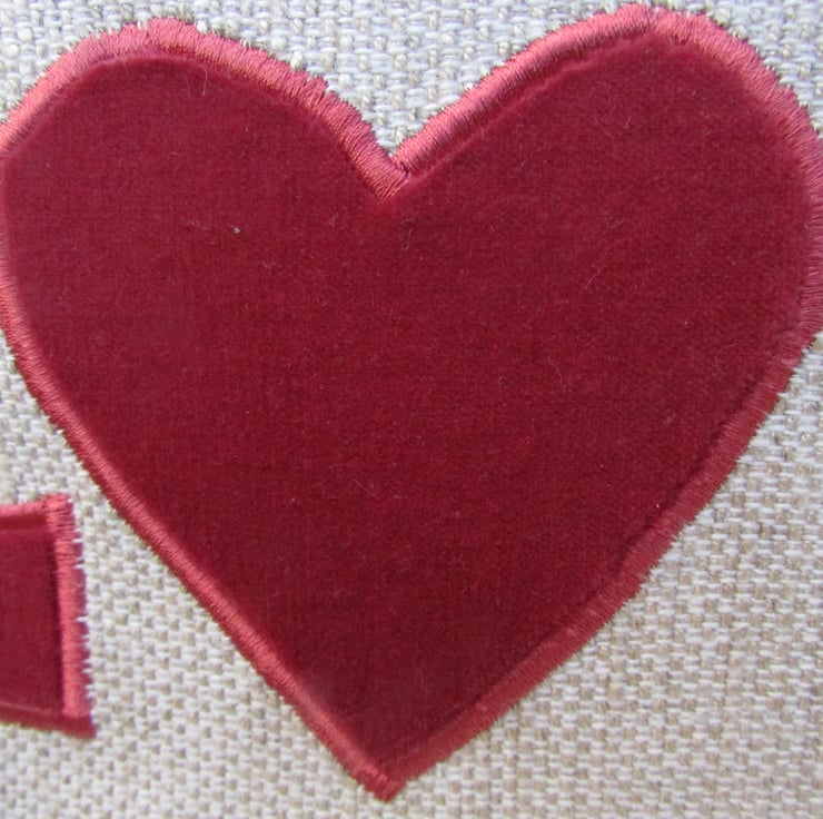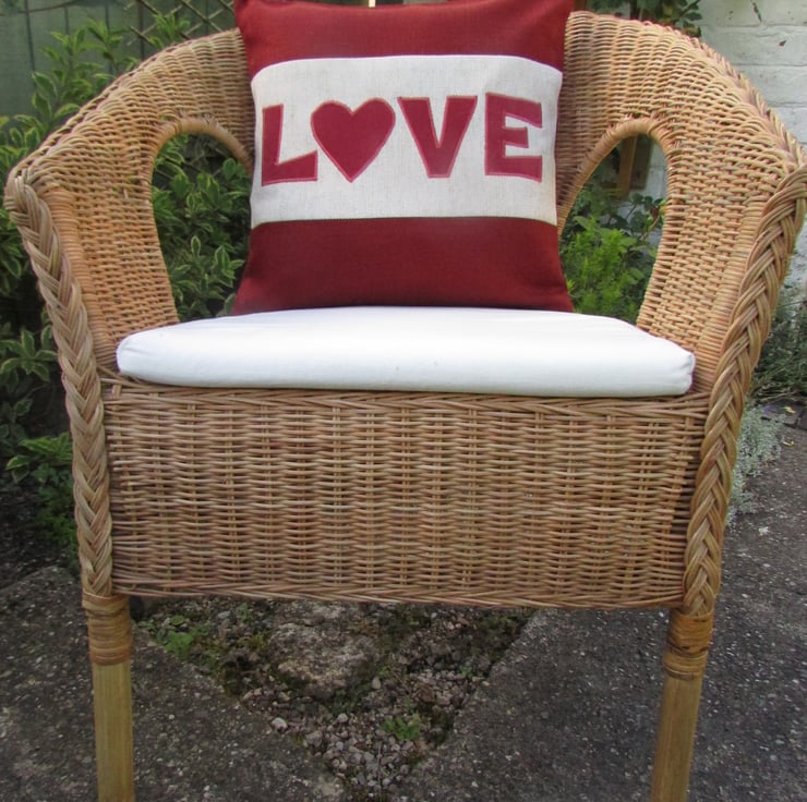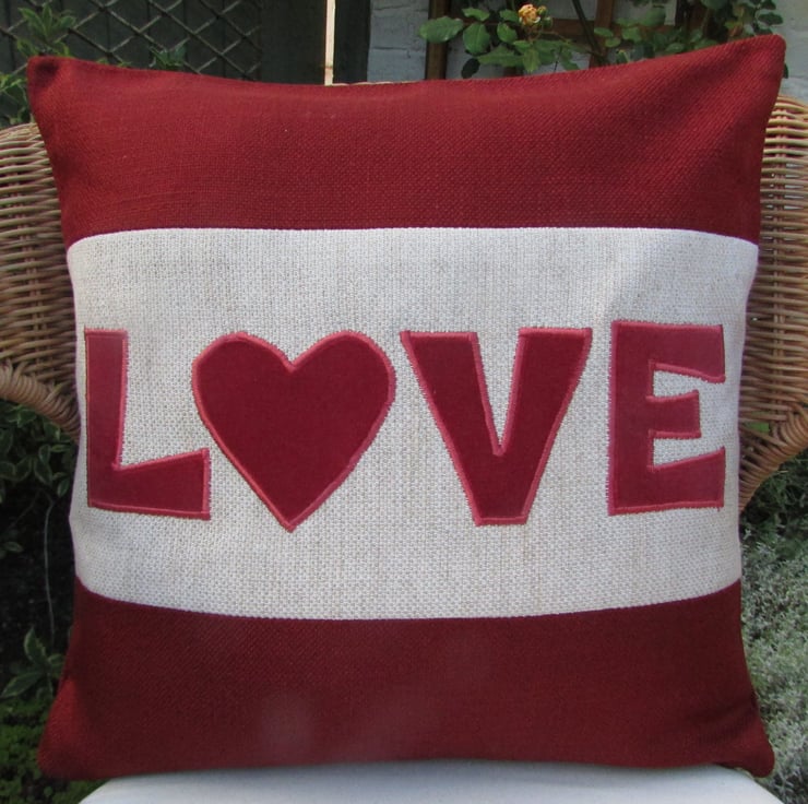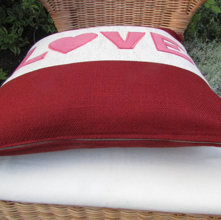 16" (40cm) shabby chic style cushion. The red cover has a rustic cream central horizontal panel with the word "LOVE" appliqued in a luxurious red velvety fabric.