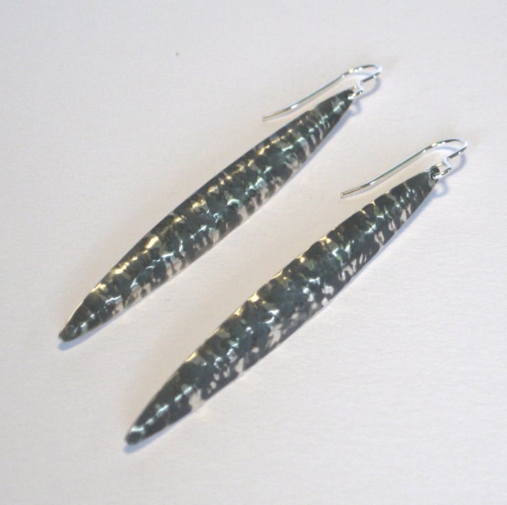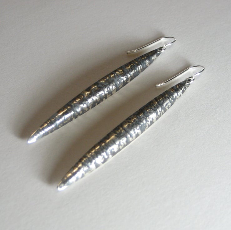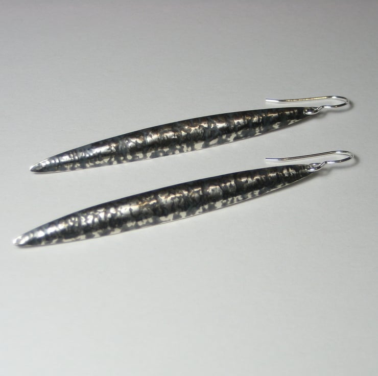 Handmade in my Yorkshire studio, these Sterling Silver Earrings which are part Oxidised to create the two tone black and silver colour contrast are part of my Blackwave Range. They are a long slim oval drop which has been gently domed and textured using the technique of Repousse. The drops are each hung from an elegant Sterling Silver earwire. The technique I use is produced by hand so each pair is unique.