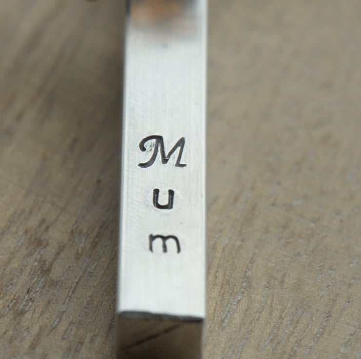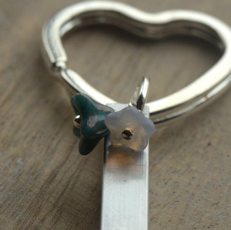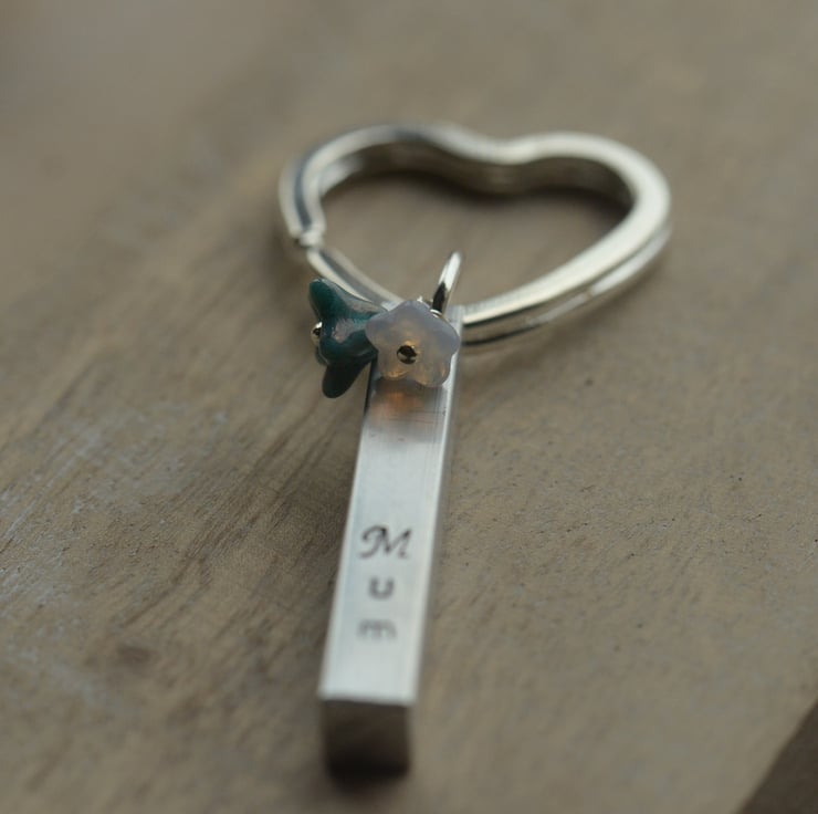 Hand stamped Aluminium Bar, this particular version which has been stamped with the word "Mum" with a little bouquet of Aqua and White opal Czech glass flower cups above. The bar has been attached to a strong silver plated jump ring and a large silver plated heart shaped key ring. There is also a little duo of heart motif on the back.