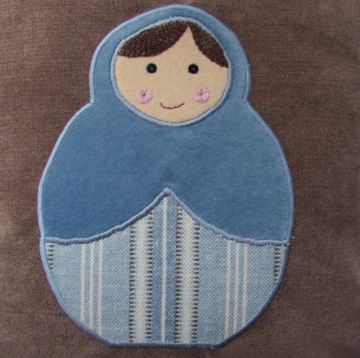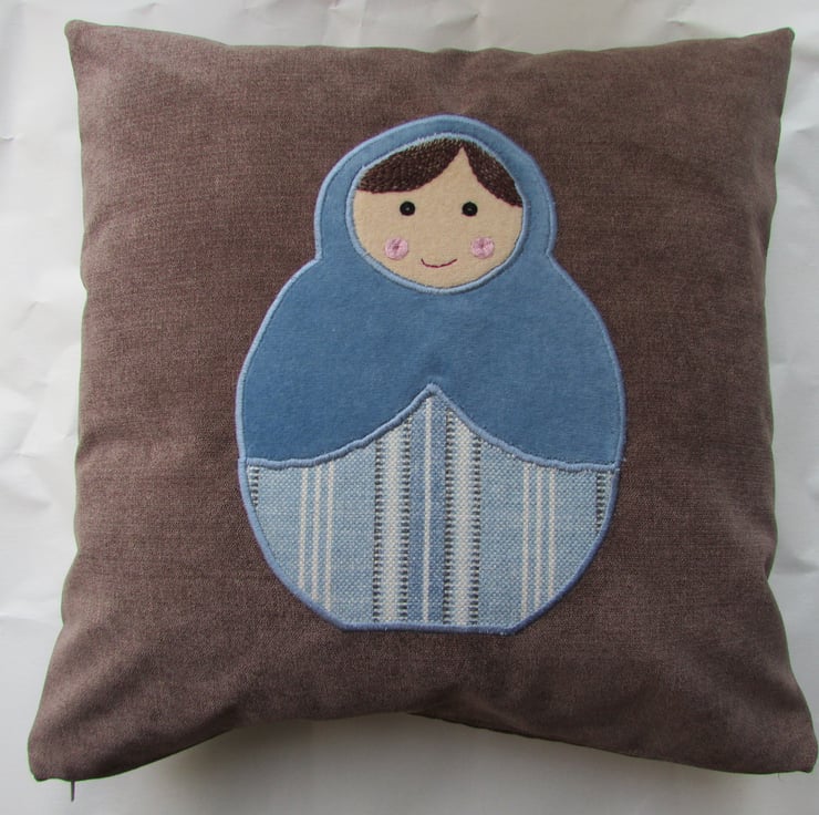 16" (40cm) cushion. A luxurious brown velvet-finish cover with an appliqued Russian doll in shades of blue and cream. The hair and facial features have been lovingly hand-embroidered and finished with sequins.