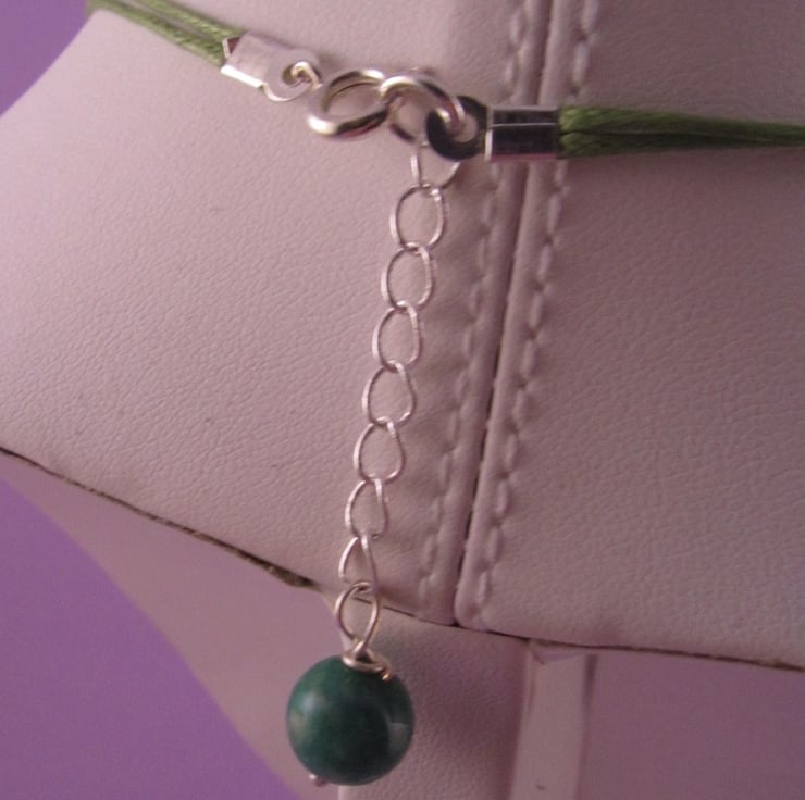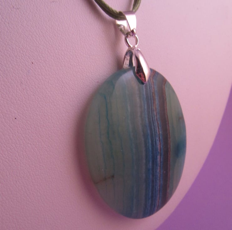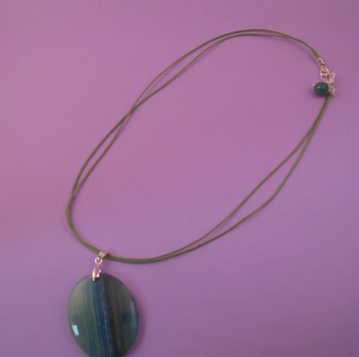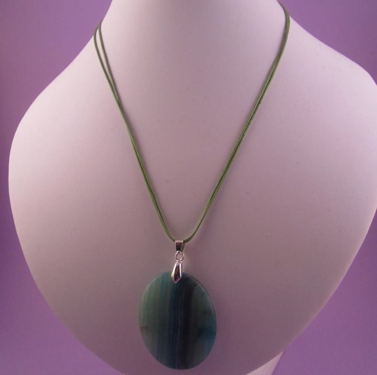 This is a pretty green striped agate pendant necklace. It is created with a real striped green agate oval shaped gemstone, silver plated brass, silver plated copper, green waxed cord and a real green jasper gemstone on the extender. The stripes in blue are beautiful, and it has a real organic feel. This beautiful piece is great for casual wear.