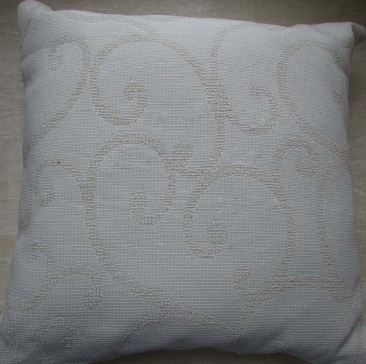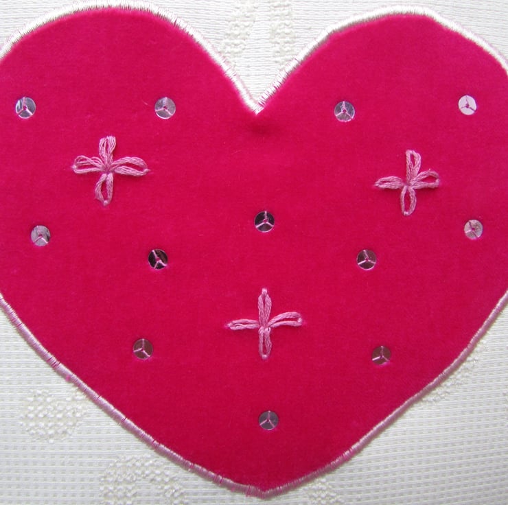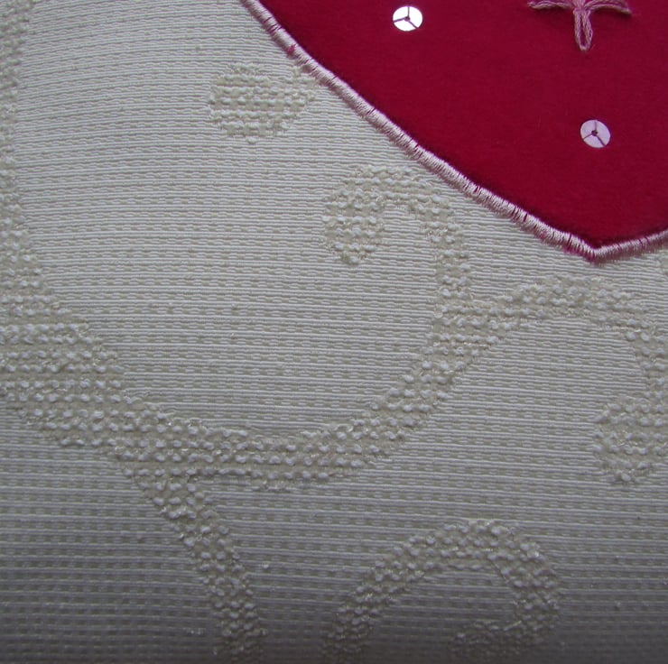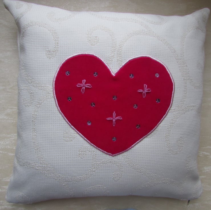 16" (40cm) cushion. A lovely cream swirl-patterned cover with an appliqued heart in hot pink velvet-finish fabric. The heart has been hand-embroidered with pale pink lazy daisies and embellished with pale pink sequins.