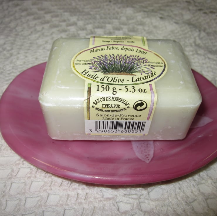 This oval soap dish has a pale pink daisy made from homemade glass paper on a pretty mid-pink marbled opal glass and is approximately 14cm by 10cm with a textured base for drainage. It has been fully annealed to make it strong. This would make a great gift or treat. I have included a free bar of lavender scented Provençale olive oil soap