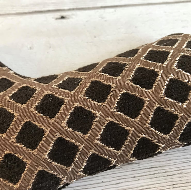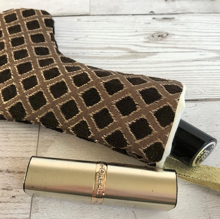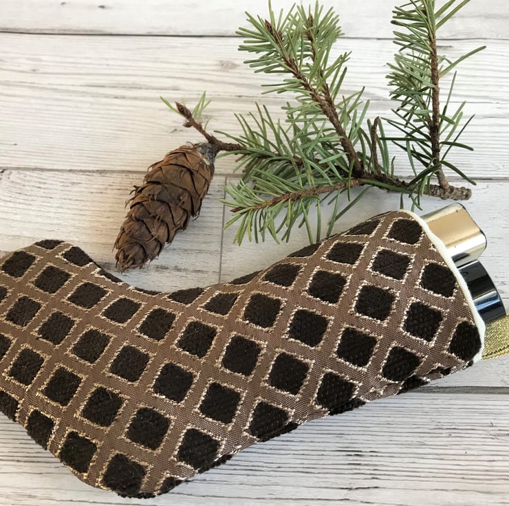 Dark brown and gold fabric with textured diamond lattice pattern. Fully lined with cream fabric. Sparkling gold hanging ribbon.