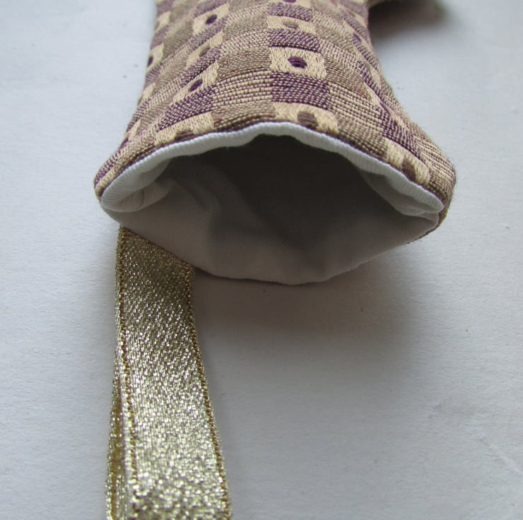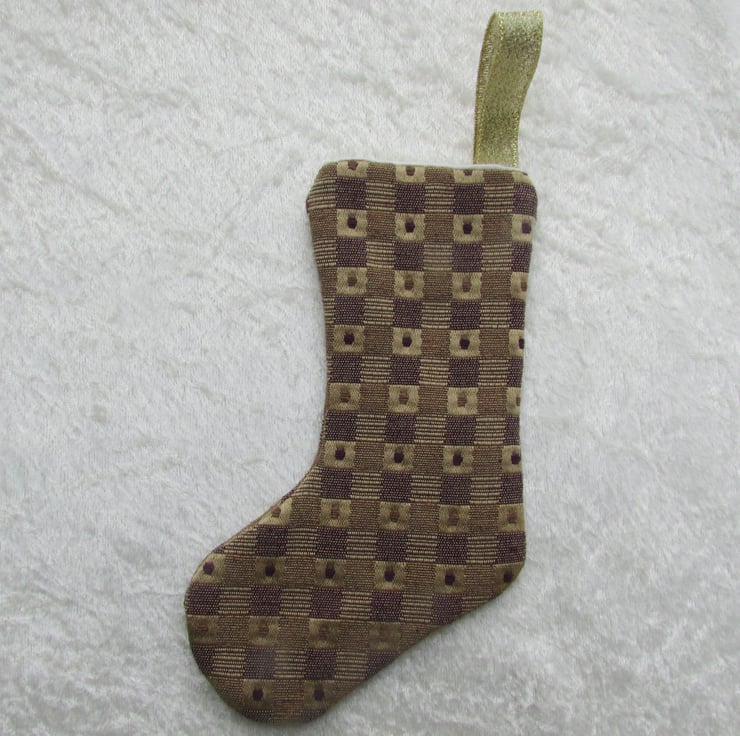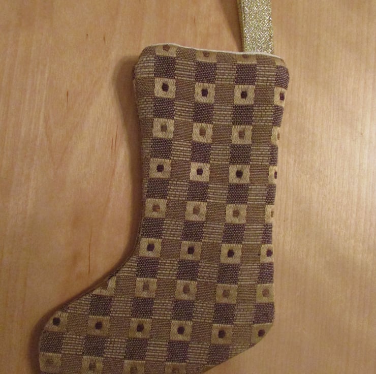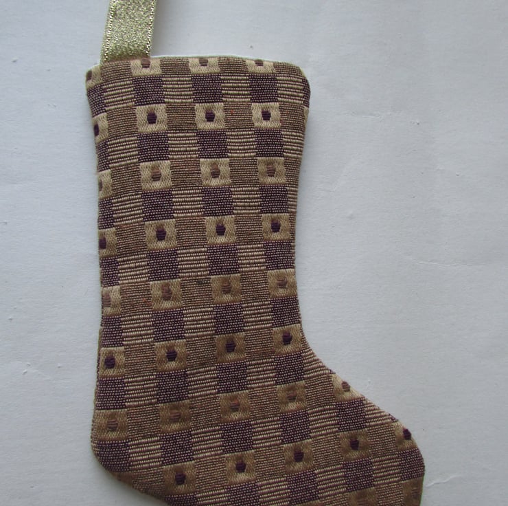 Little Christmas stocking in gold and plum fabric in a woven check pattern. Fully lined with cream fabric. Sparkling gold hanging ribbon.