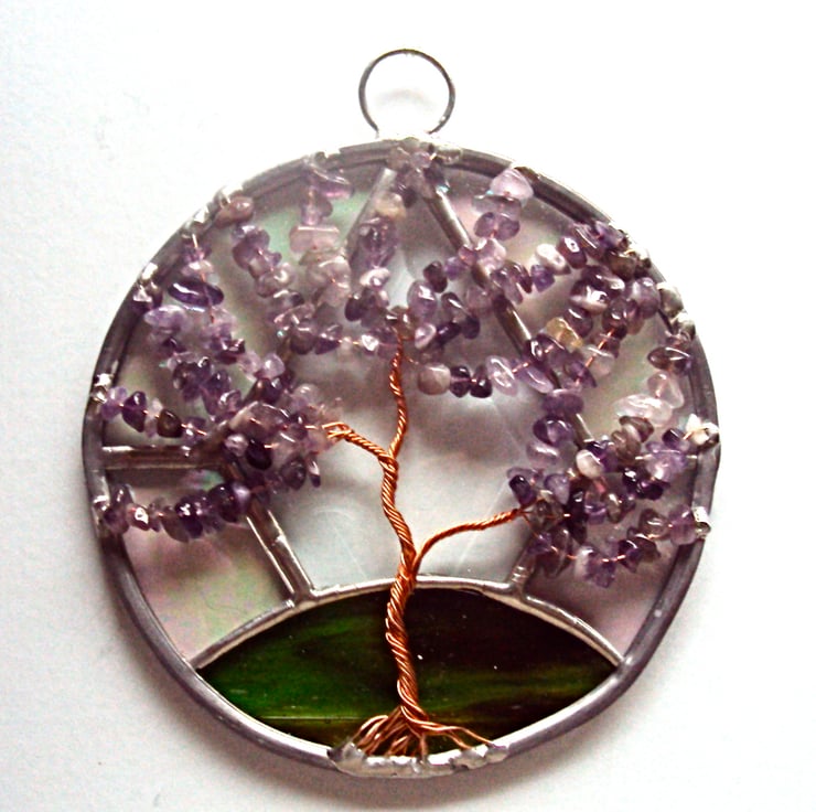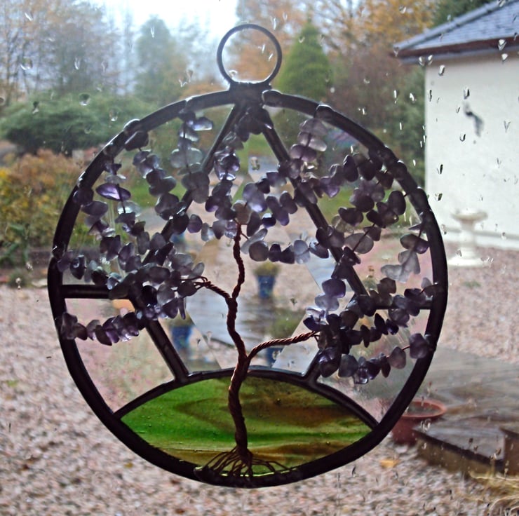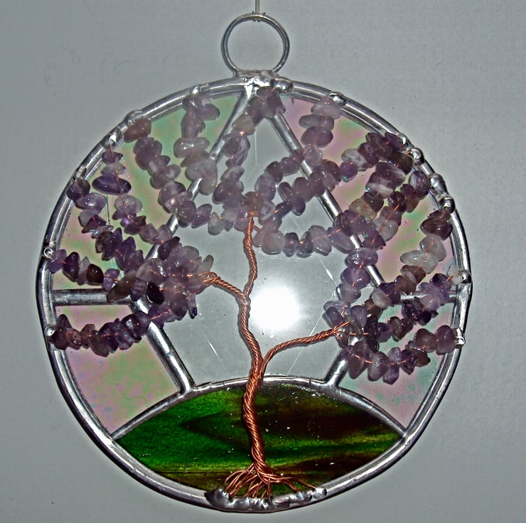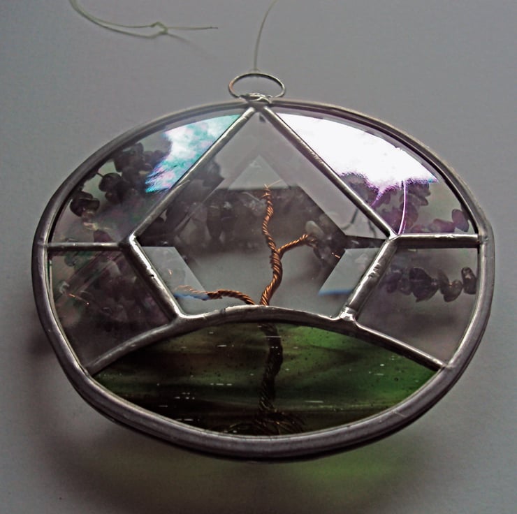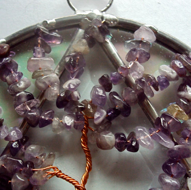 The hanging measures 130mm diameter and is made from irridised baroque glass with a translucent green and brown mix glass base and a diamond bevel all of which have been wrapped in copper foil and soldered together.. The tree is made from twisted copper wires and heavily decorated with tumbled amethyst gemchips .