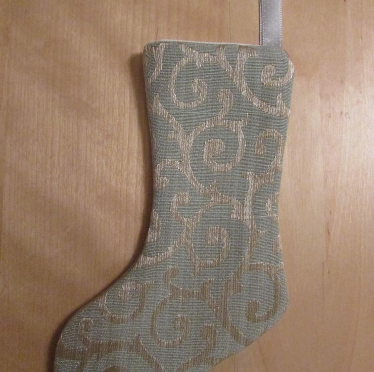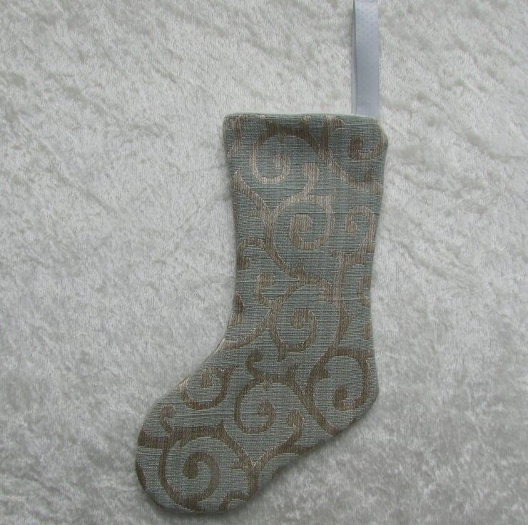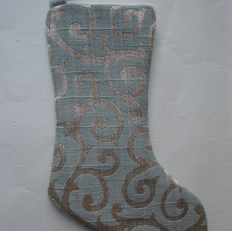 Small Christmas stocking in pale duck egg blue fabric with a pale gold woven swirl pattern with a lovely sheen. Fully lined with cream fabric. Pale grey polka dotted satin hanging ribbon.