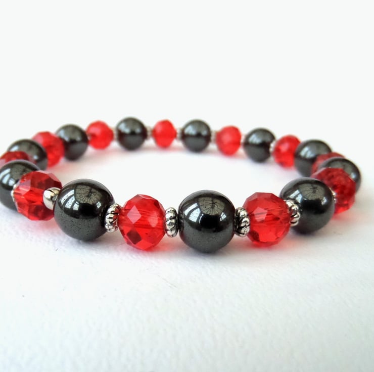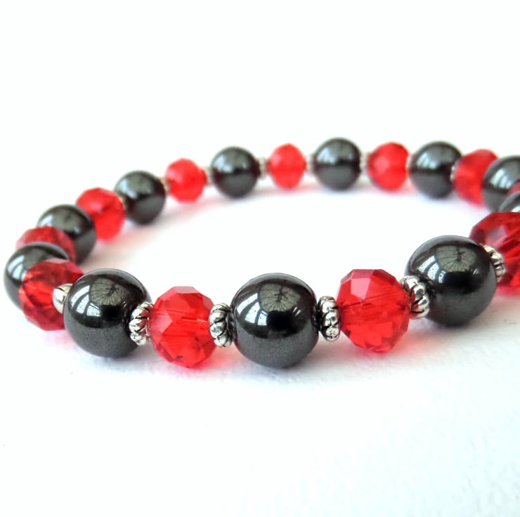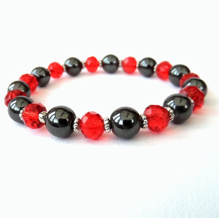 8 mm hematite rounds and faceted red crystals make a great combination in this unique bracelet.