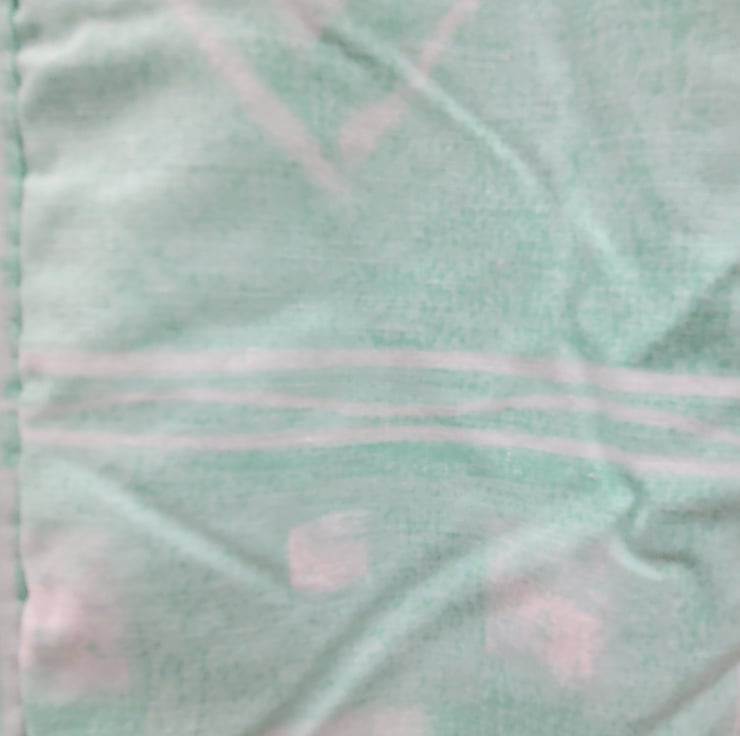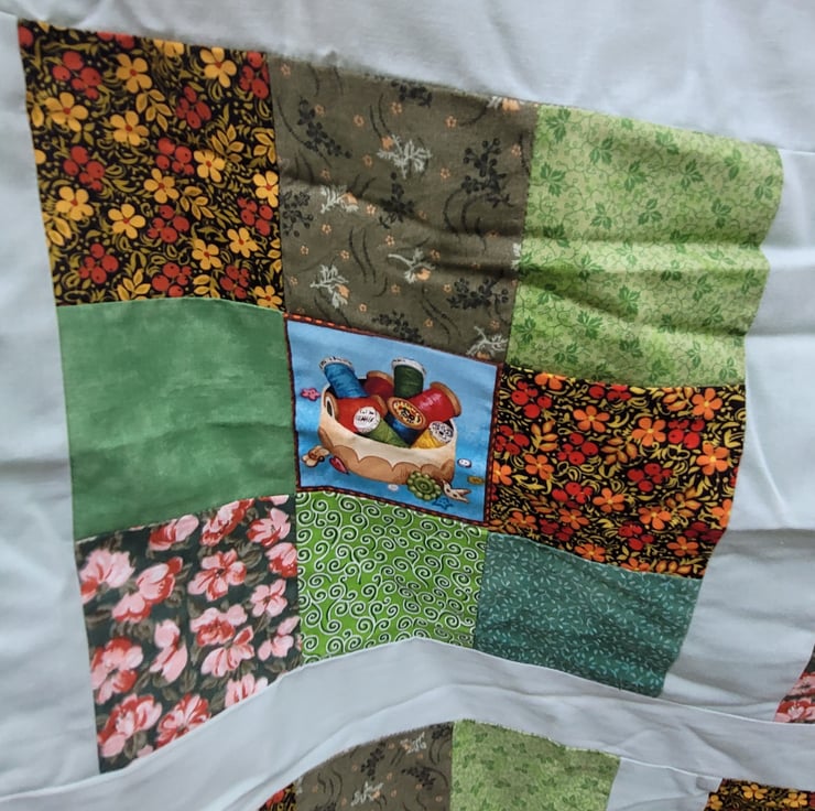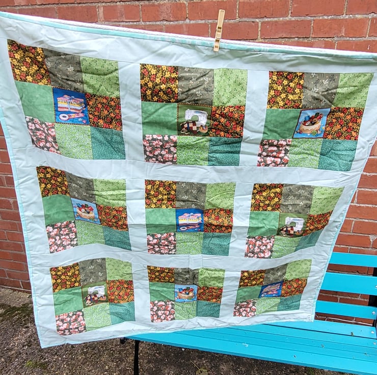 Homemade sewing design quilt. 100% cotton top. Backed with a co-ordinating green cotton fabric. Inside is 2oz polyester wadding.