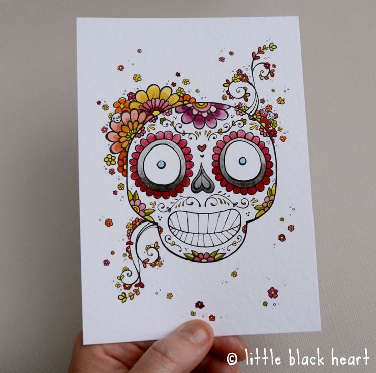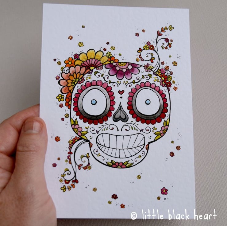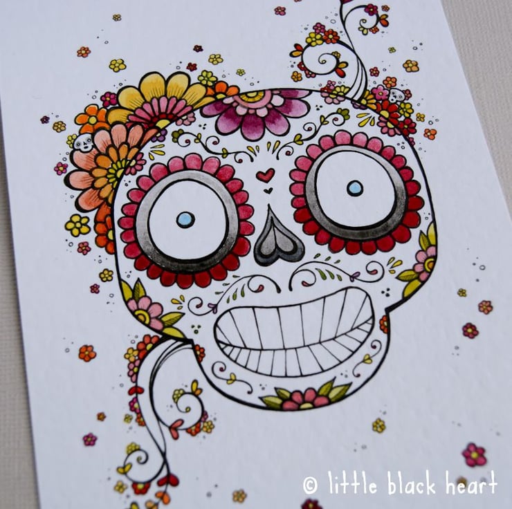 a big sugarskull, with a sweet smile, surrounded by lots of flowers and decorative bits!