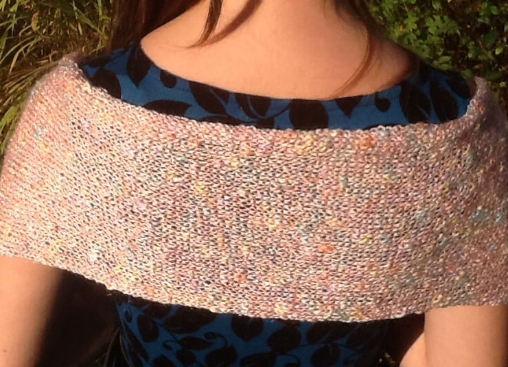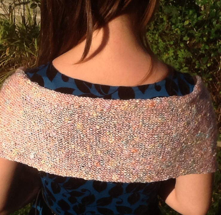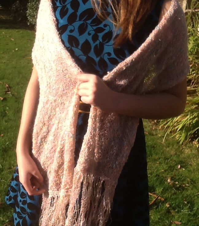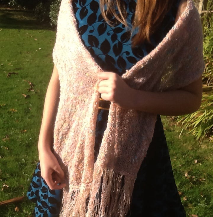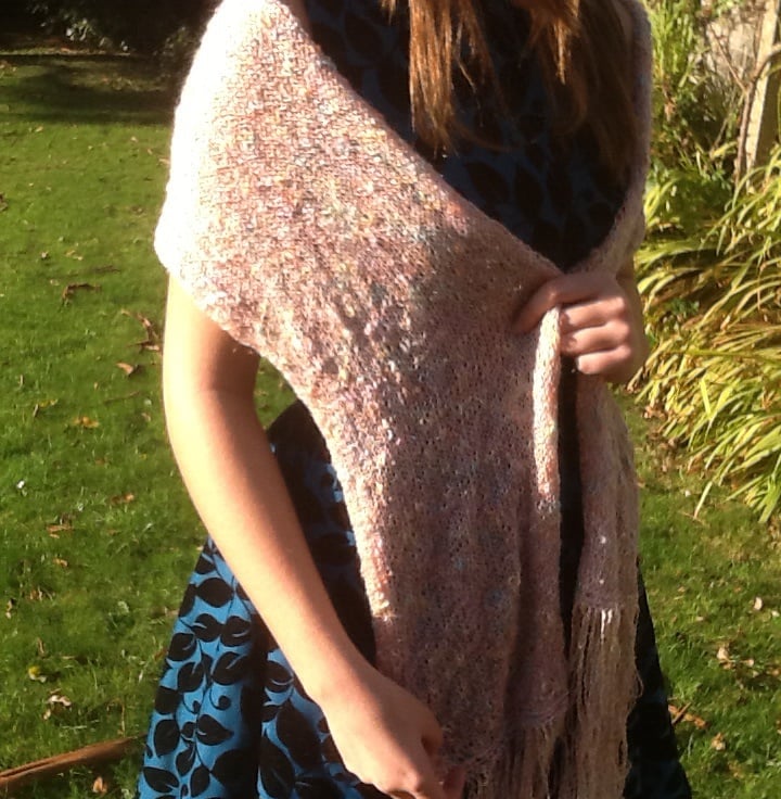 This shoulder wrap is very fine, it has been knitted on large needles to give a loose, lacy look, and then completed with a crocheted edge at either end and applied finge. The yarn is a beautiful multiple-tonal soft pink, with hints of pale blue, green and lilac. There is a soft shimmer within the yarn and is super soft!