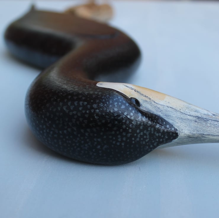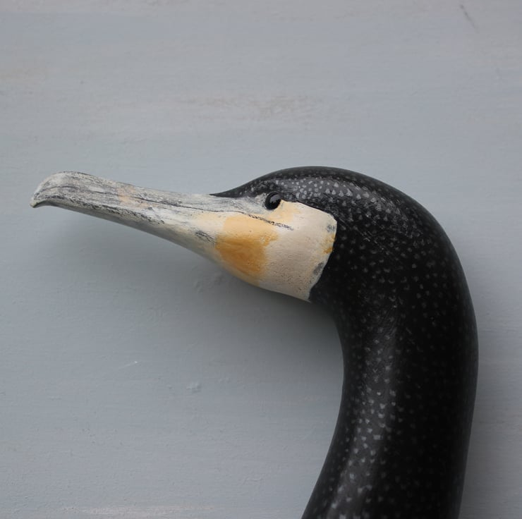 I find the stunning shape of cormorants irresistible! They can usually be seen basking near the Quay in Exeter. The black plumage shimmers in real life and the use of pearlescent highlights and wax seems to capture this on the carving. This wall mounted bird is perfect if you do not have space for the free standing version.