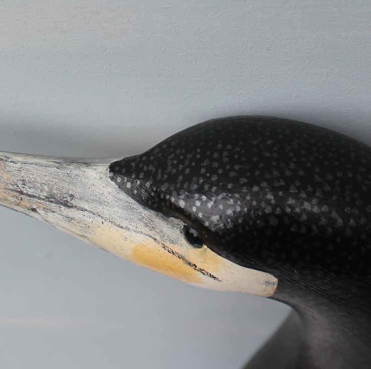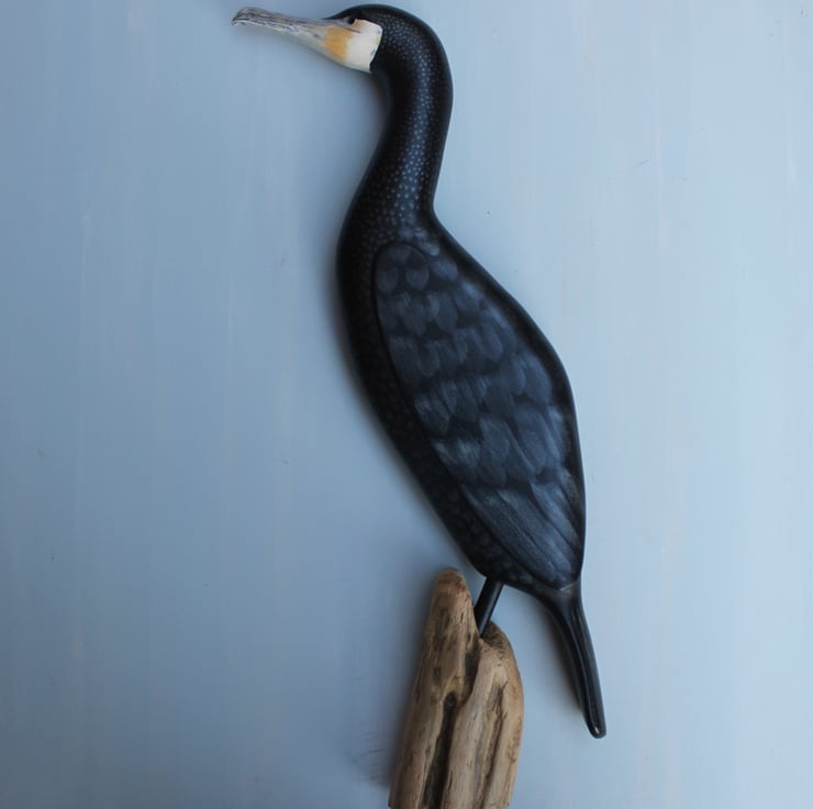 This wall mounted cormorant is hand carved from 3cm thick jelutong, painted with acrylics and finished to a soft shine with wax. It has a hand coloured glass eye and plumage detail is suggested with pearlescent detail. It is mounted on driftwood and will sit flush to the wall on an angled nail/screw. The piece is 40cm tall and approx. 15cm wide overall.