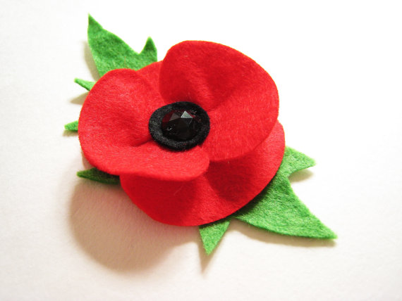 Poppy measures 6cm diameter with leaf extending to 12cm. I have used good quality wool blend felt and added a pretty faceted black bead at the centre which catches the light.