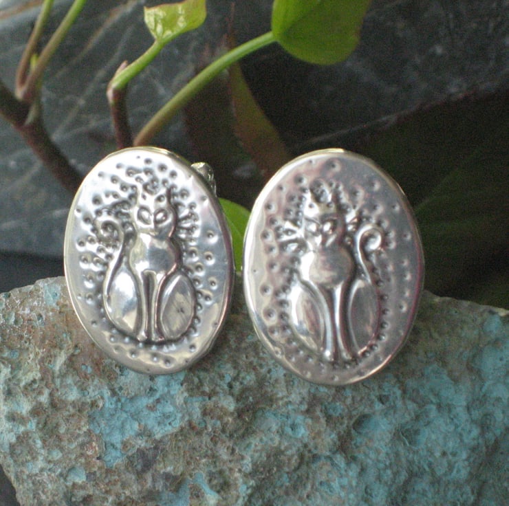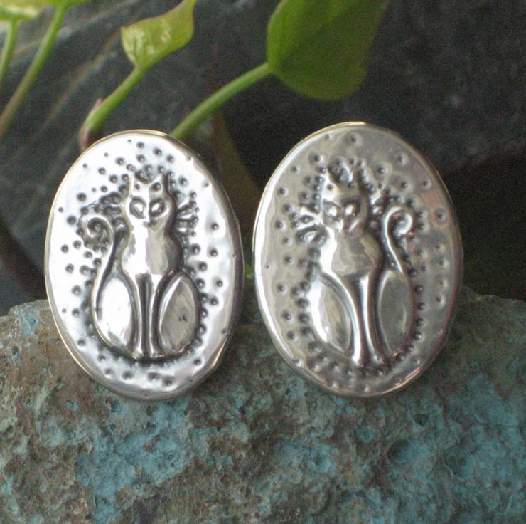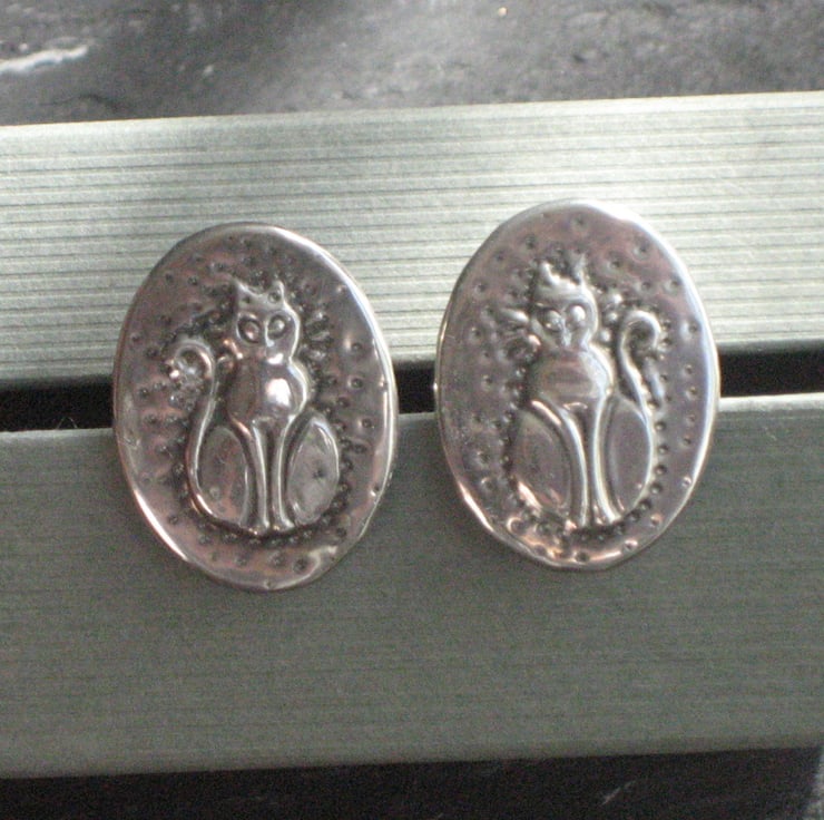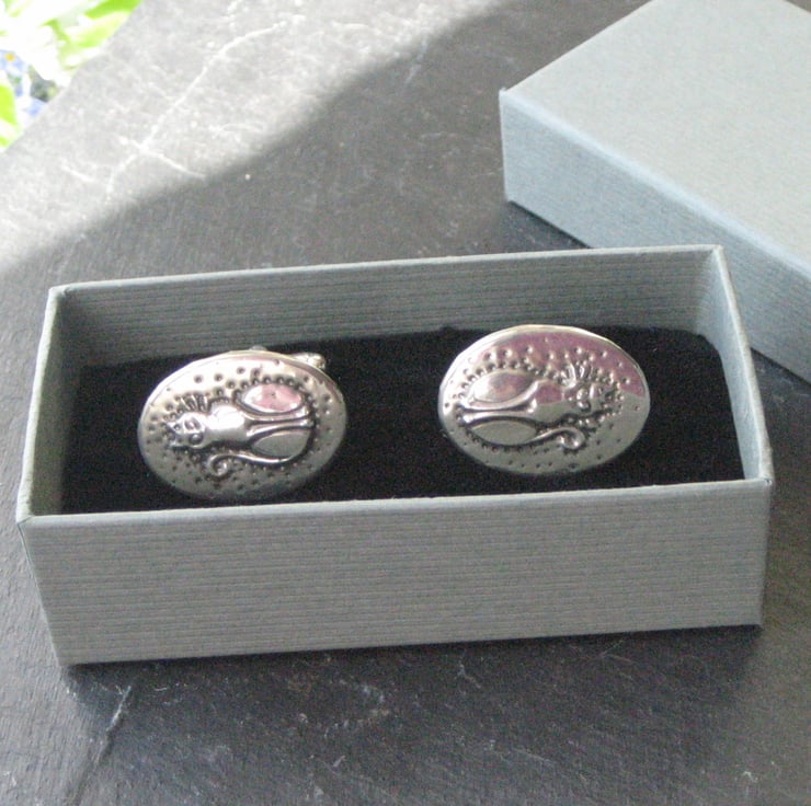 Cufflinks handmade in pewter, cat design. These cufflinks have been individually hand-made in pewter using the repousse method. Each cufflink measures 26 x 20mm. Cufflinks are presented in a smart grey gift box. Cufflinks make a great gift for a man for a 10th Wedding Anniversary, Birthday or Christmas.