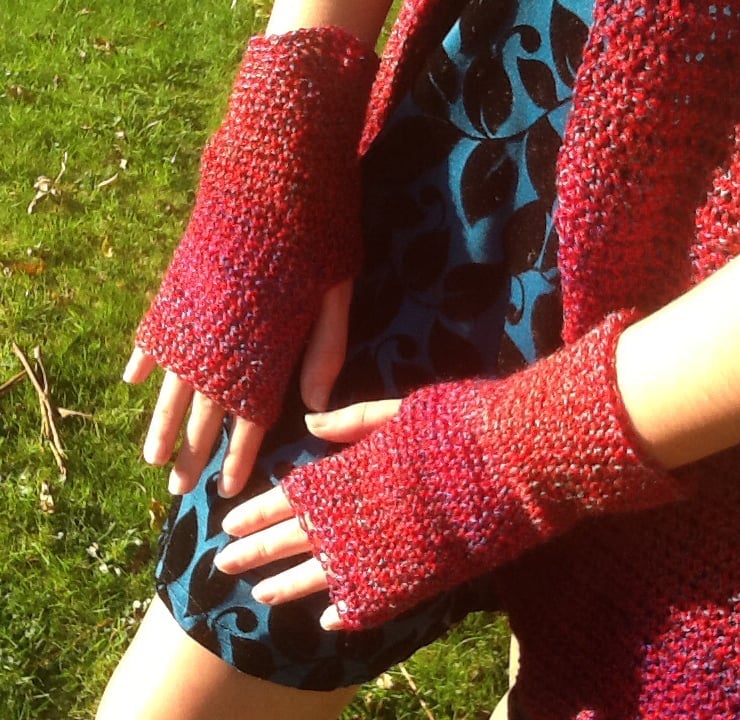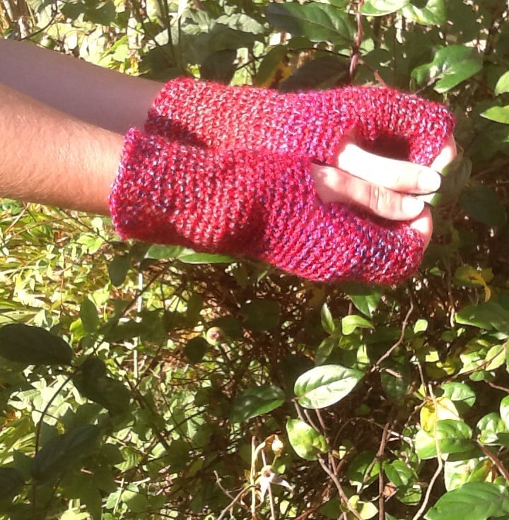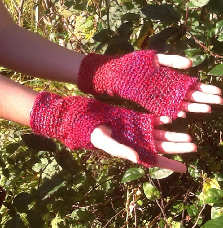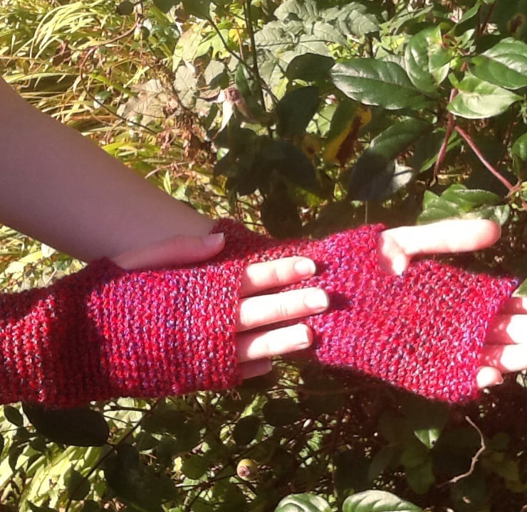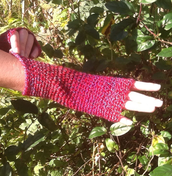 The yarn for these crocheted fingerless mittens is a beautifully soft and is a wonderful deep cranberry tone and is multi-tonal!