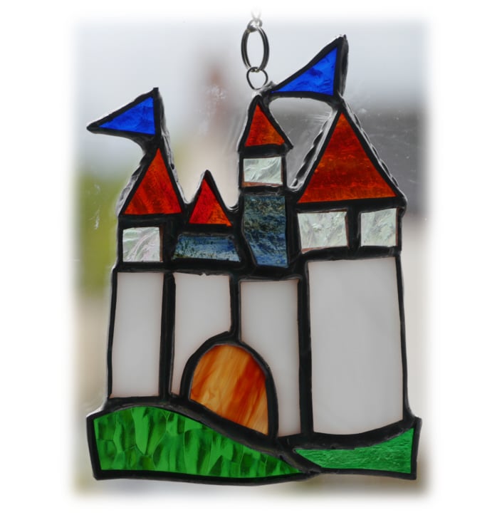 I have made this as a fairytale castle in streaky white glass with a brown 'wooden' door, tiny sparkly clear glass windows at the top of the turrets which have pointy terracotta roofs.
