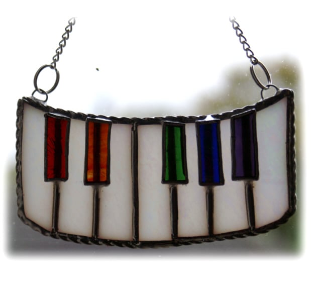 I've made an octave of keys in shiny ivory white glass with an iridescent shimmer. I've made the accidental keys, not in black like a real piano, but in five rainbow shades.