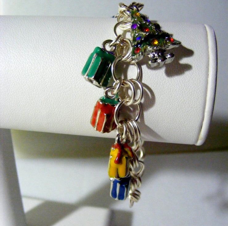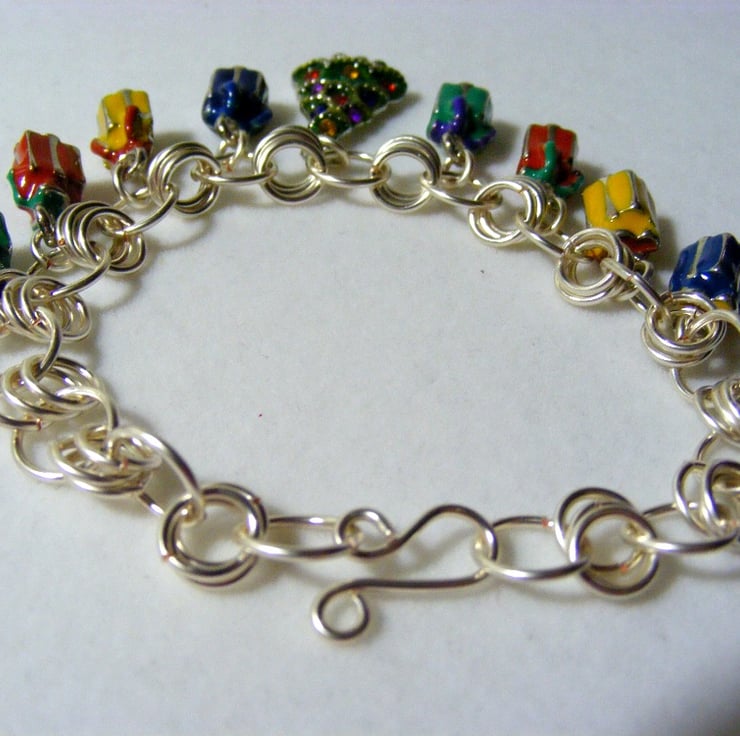 I have made this festive fun charm bracelet using assorted colour metal christmas present charms and a metal christmas tree charm.