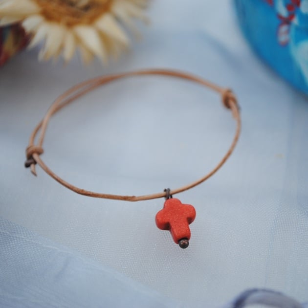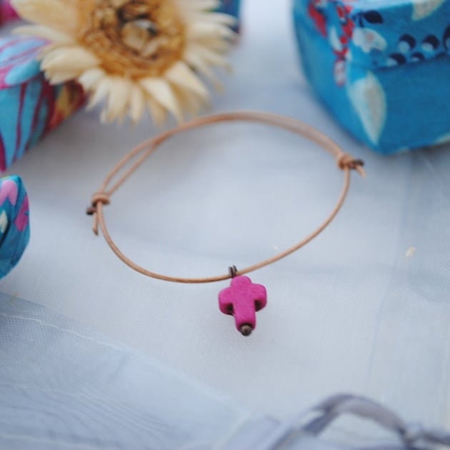 A simple friendship bracelets made with natural leather with a howlite cross charm in pink