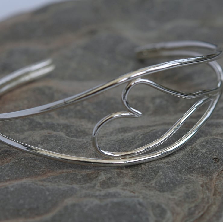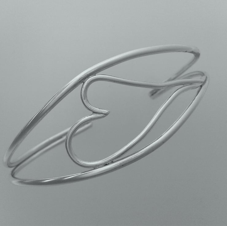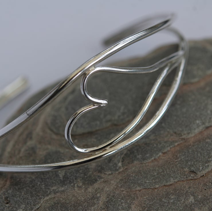This stunning bangle features two outer cuffs made from 2mm sterling silver wire, soldered together at the ends and enclosing a graceful sinuous heart shape. It would make a lovely romantic gift for a loved one or a special present for someone who loves pretty things. It is 16cm in length and can be adjusted to fit a range of wrist sizes.