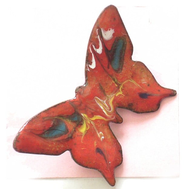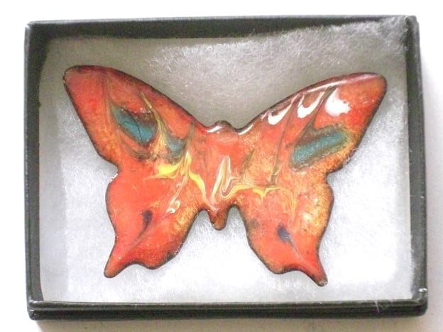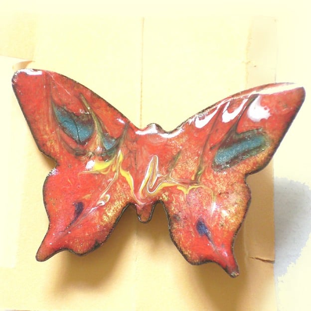 This scrolled glass enamel brooch has a patterning made by drawing a steel tip through the enamel while it is in the kiln at red hot; it has been counter-enamelled to balance the expansion and contraction of the worked surface through numerous firings; the brooch bar is 1.8cm with a rotating lock, soldered to the piece; it is mounted lengthways along the butterfly's body.