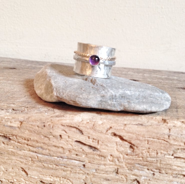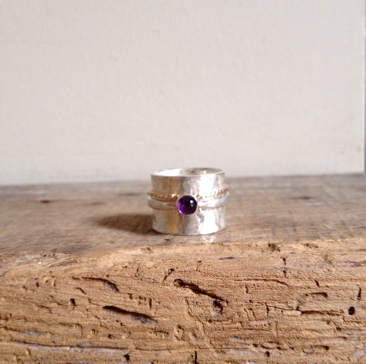 This ring is made from a 15mm wide silver band. A gold filled ring and an amethyst ring are attached to the band with a tight fit. The ring is hammered for texture and is a size O but will fit a size N finger.