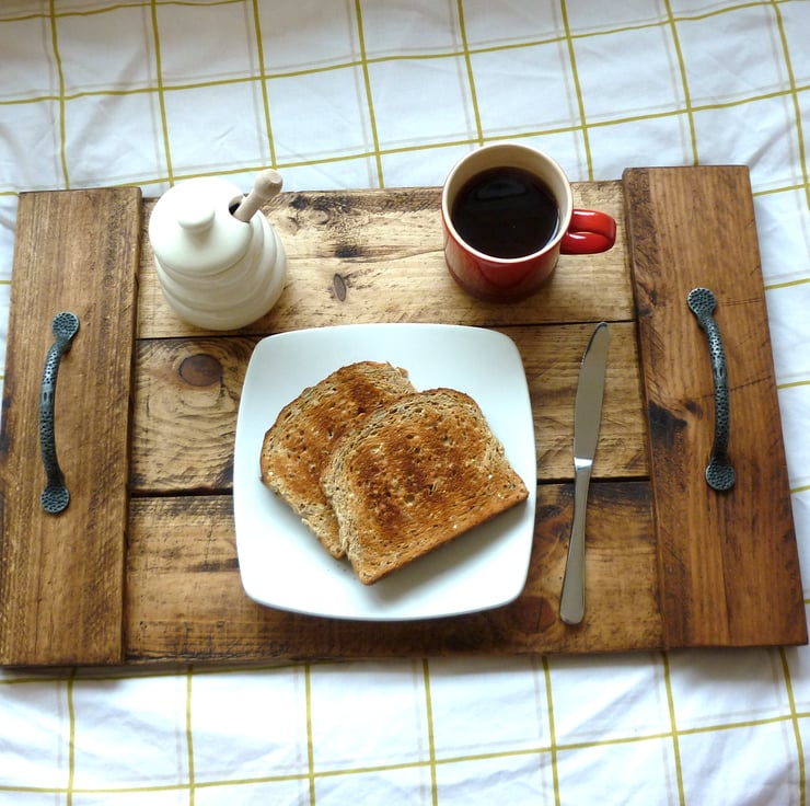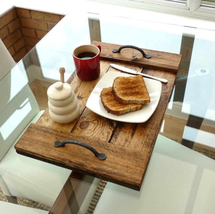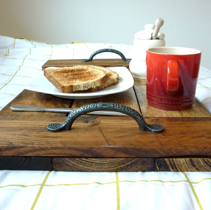 The tray has been sanded to a nice smooth finish and then treated with a coat of rustic brown wax which is made up of a blend of natural raw materials such as Beeswax and Carnauba wax. The wax enhances the natural grain of the wood, and is also water repellent.