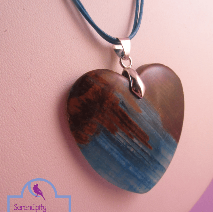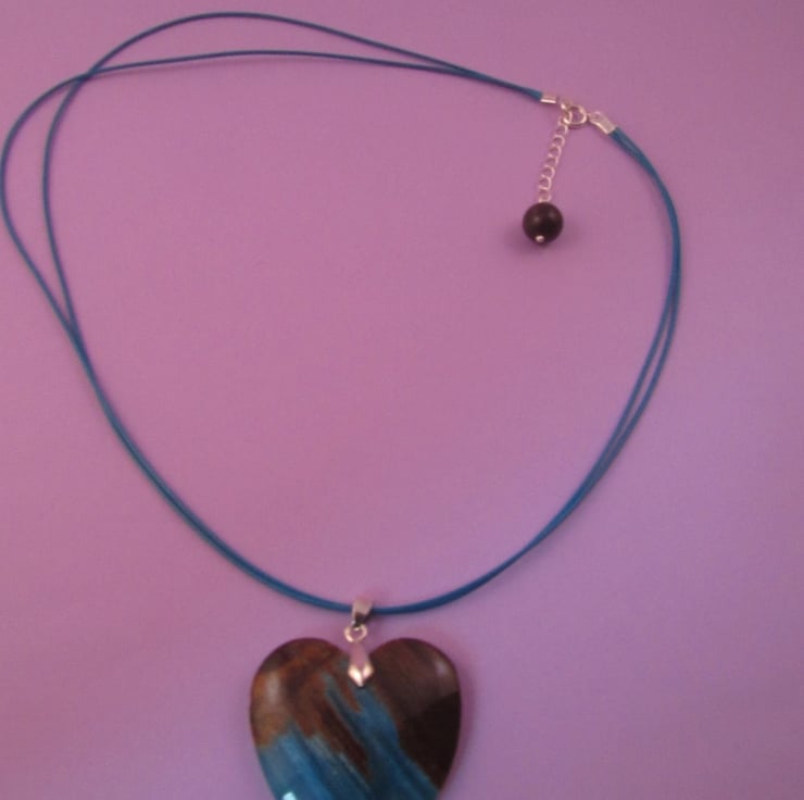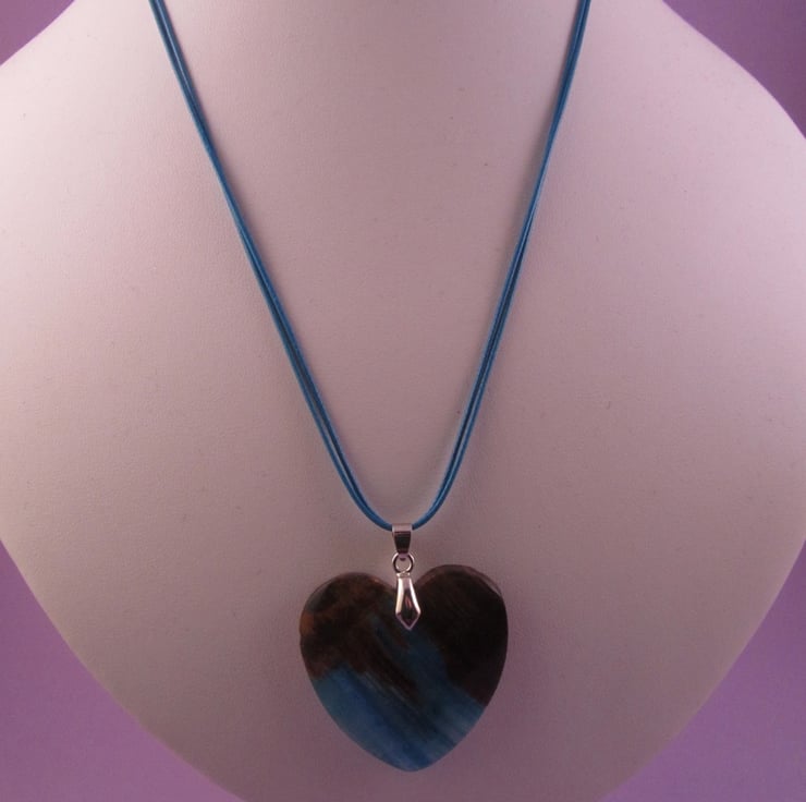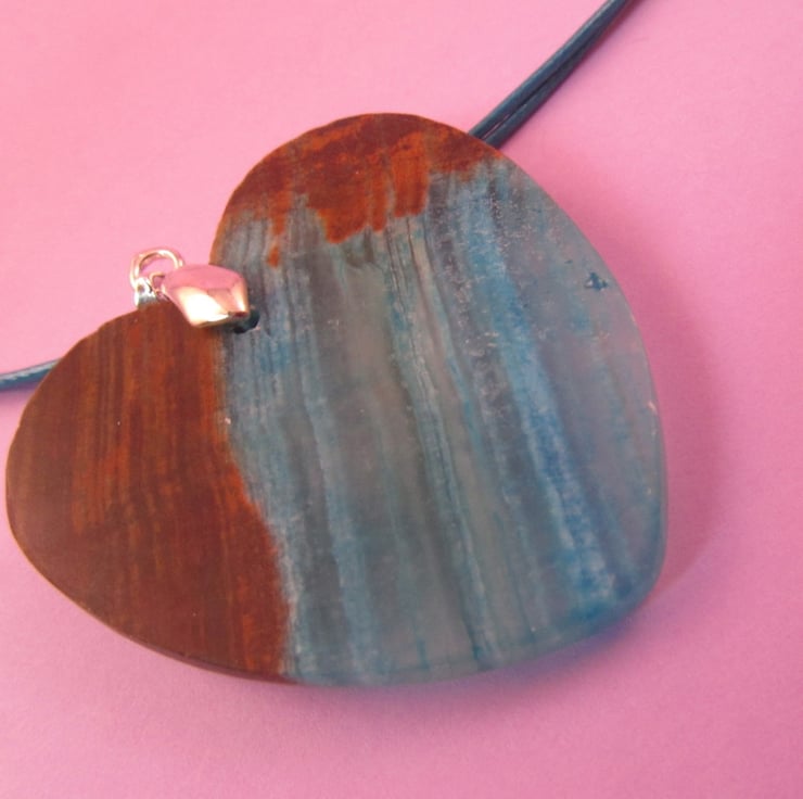 This is a pretty brown blue agate heart pendant necklace. It is created with a real brown blue agate heart gemstone, silver plated brass, silver plated copper, blue waxed cord and a real brown agate gemstone on the extender. This is so cute, and would really go with jeans or any casual wear.
