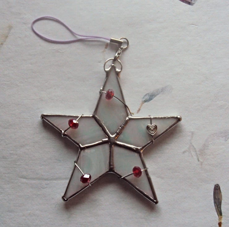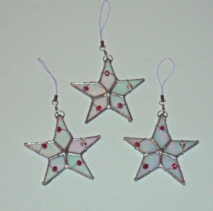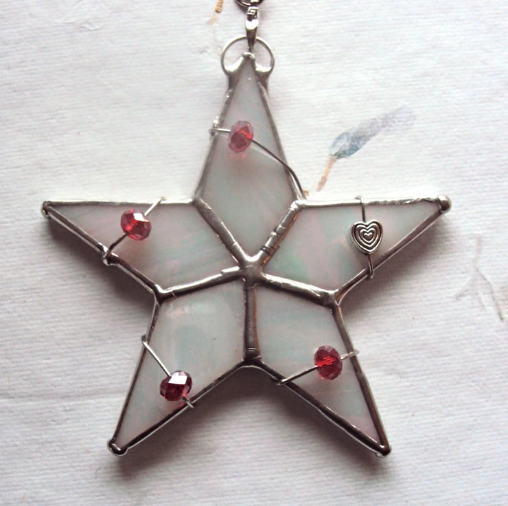 Three stained glass stars made from irridised white glass pieces that have been wrapped in copper foil and soldered together with faceted red glass beads and a silvery heart mounted on a wire wrapped around the star arms . There is a lilac hanging loop attached to each star and they measure approximately 80mm diameter.